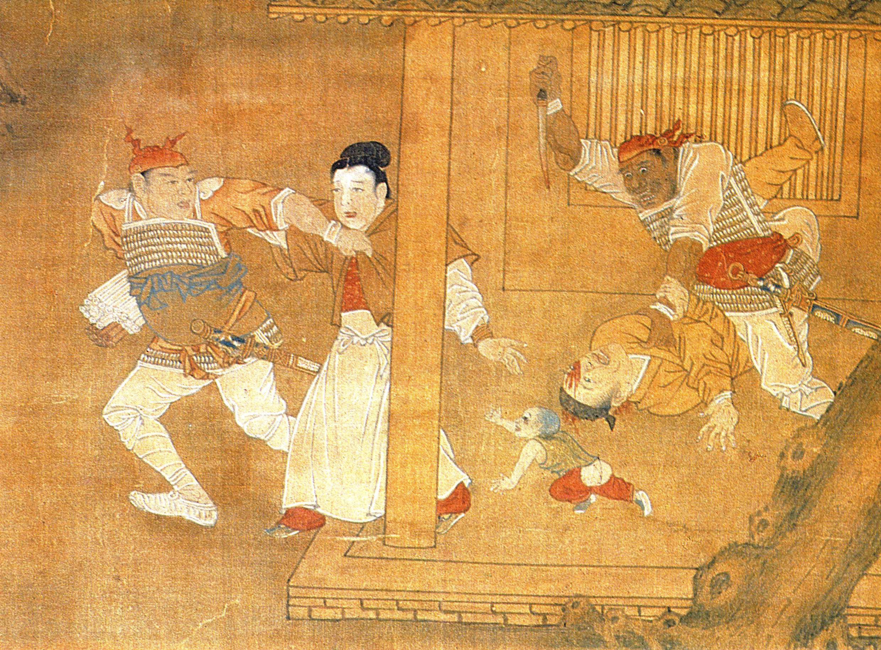 封建社会兵匪不分盗贼横行。画中所绘杀人抢劫的匪徒,身穿铠甲,人马精壮,类似官兵。主人被杀,主妇被抢,家破人亡的惨状令人发指。此画描绘人物神情生动,主题明确,深刻地反映了当时现实生活的一个侧面。