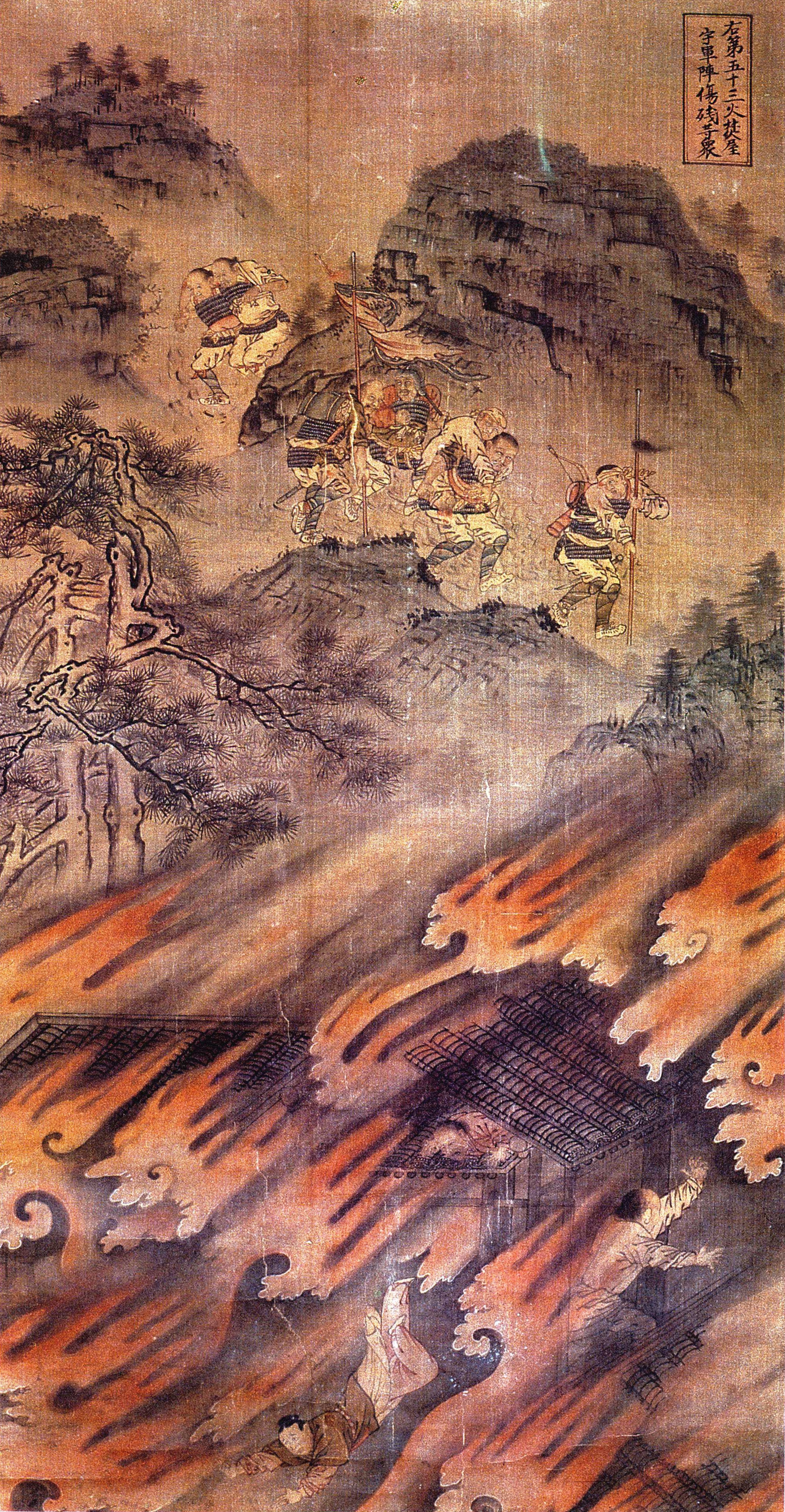 画分两层。 远景为崇山峻岭之中, 残军败将弃甲曳兵而走; 近景为屋宇被焚, 有三人被困于一片火海之中, 匍匐呼救,挣扎待毙, 反映了战争给人民带来的灾难。