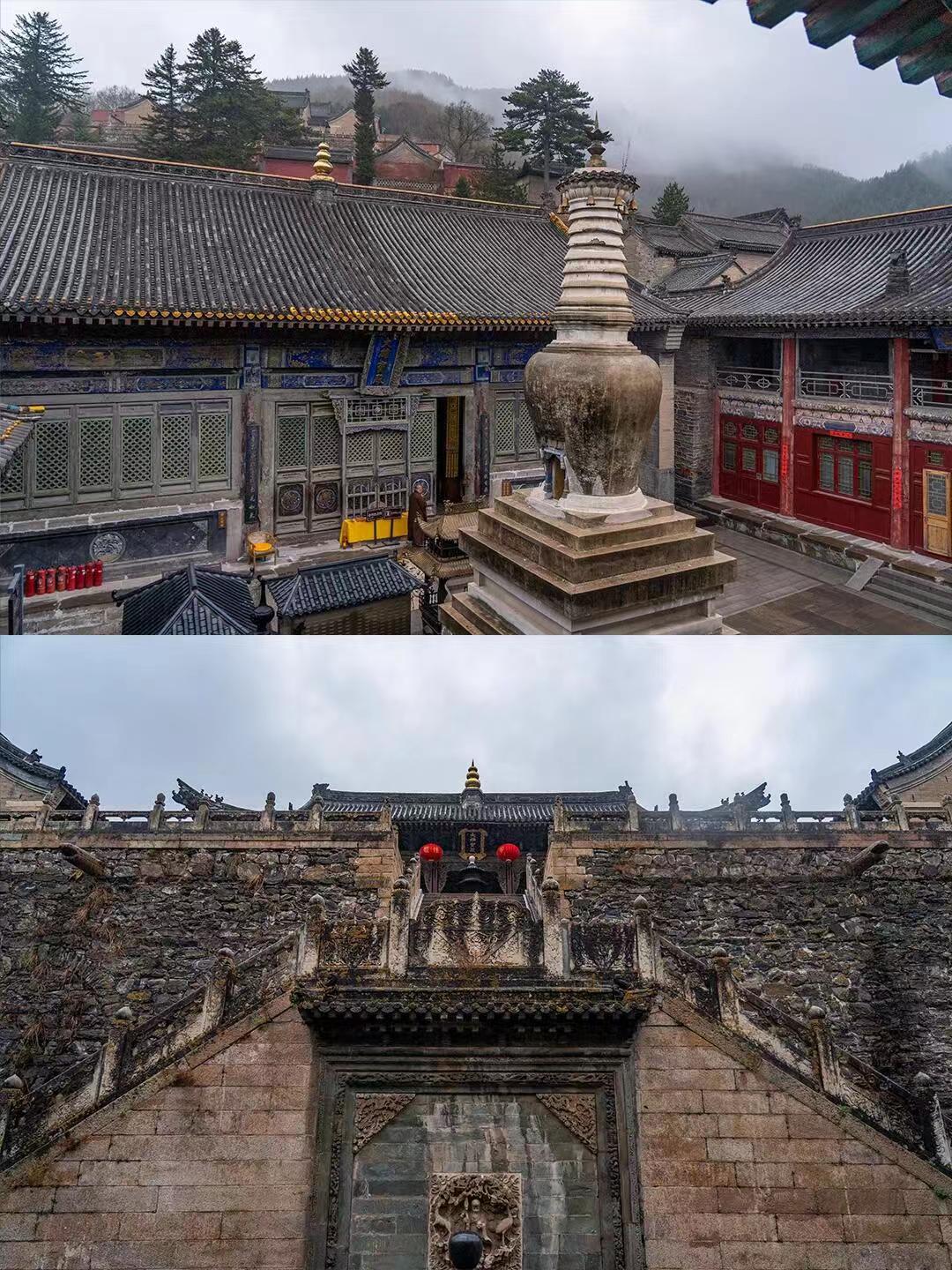 五台山南山寺由三大部分组成,下三层为极乐寺,中一层为善德堂,上三层为佑国寺。三寺均采用中国传统建筑中轴线对称的布局形式,轴线布设主体建筑,两侧布设附属建筑。此外通过排叠、聚敛、偏正、围合、隐现等多种组合方式,形成寺中有寺院中套院,既有寺院布局的宏敞,又有园林布局的幽深。