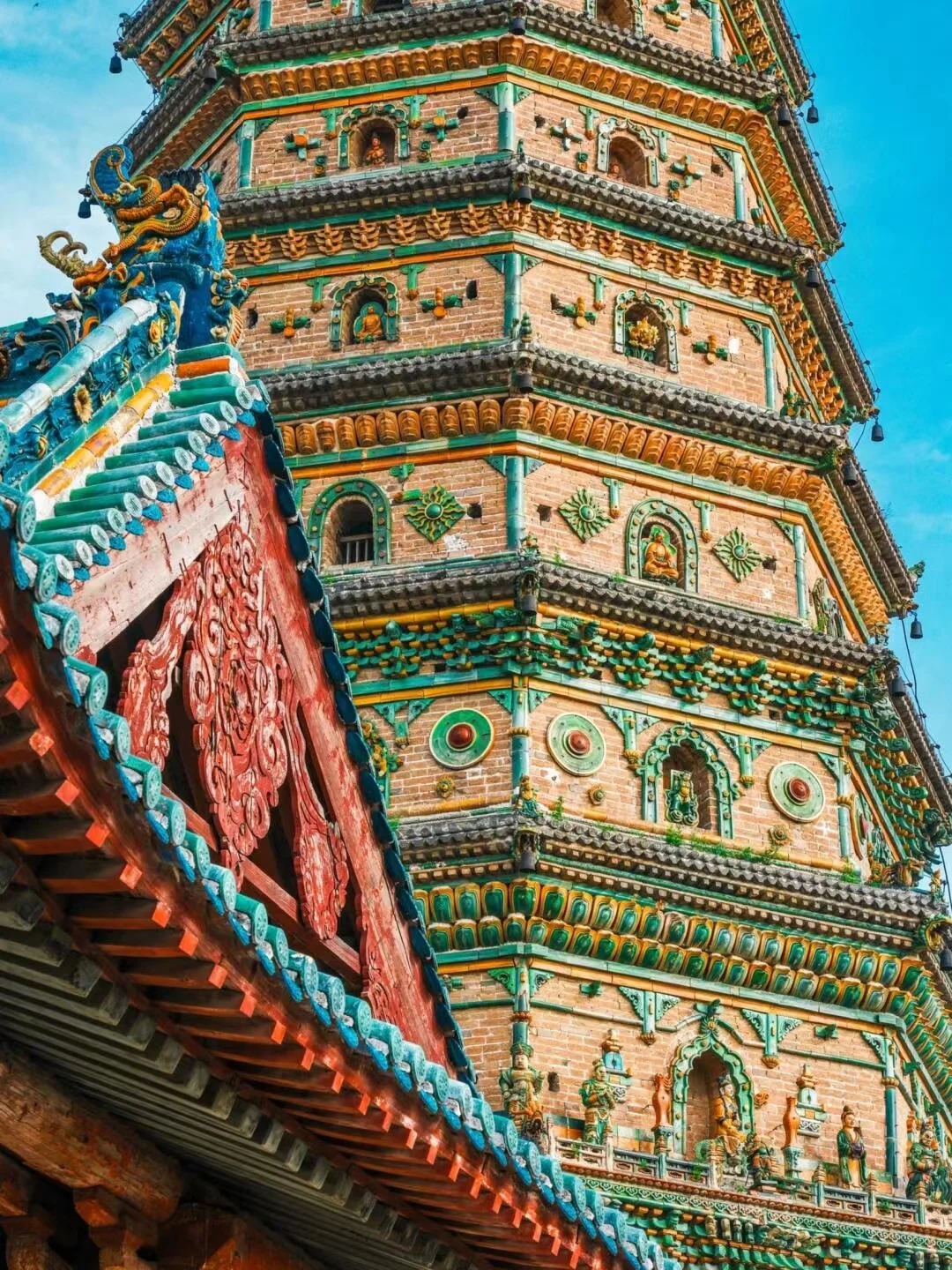 飞虹塔,位于山西省洪洞县的广胜寺景区内,其前身是始建于东汉建和元年(147年)的阿育王塔,即佛祖舍利塔,唐大历四年(769年)扩建。明正德十年(1515年)重建,现塔为明嘉靖六年(1527年)建成,明天启二年(1622年)塔身加装琉璃。