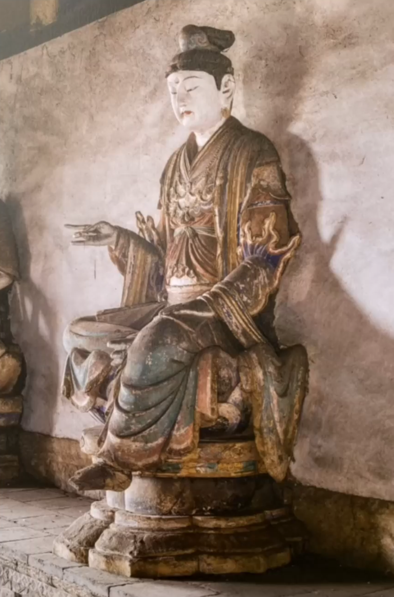 山西法兴寺圆觉殿的彩塑被坊间誉为 “宋塑之冠”“东方彩塑一绝”,十二圆觉彩塑像分列圆觉殿东西两侧,各六尊,面丰体腴,雍容大度,各尊圆觉均为坐姿,有结跏趺坐、单腿趺坐、双盘入定,或是轻松自在的如意坐姿,还有双腿交脚下垂、双脚自然下垂。手的姿态有合十、有结印,整体配合自然,神完气足。