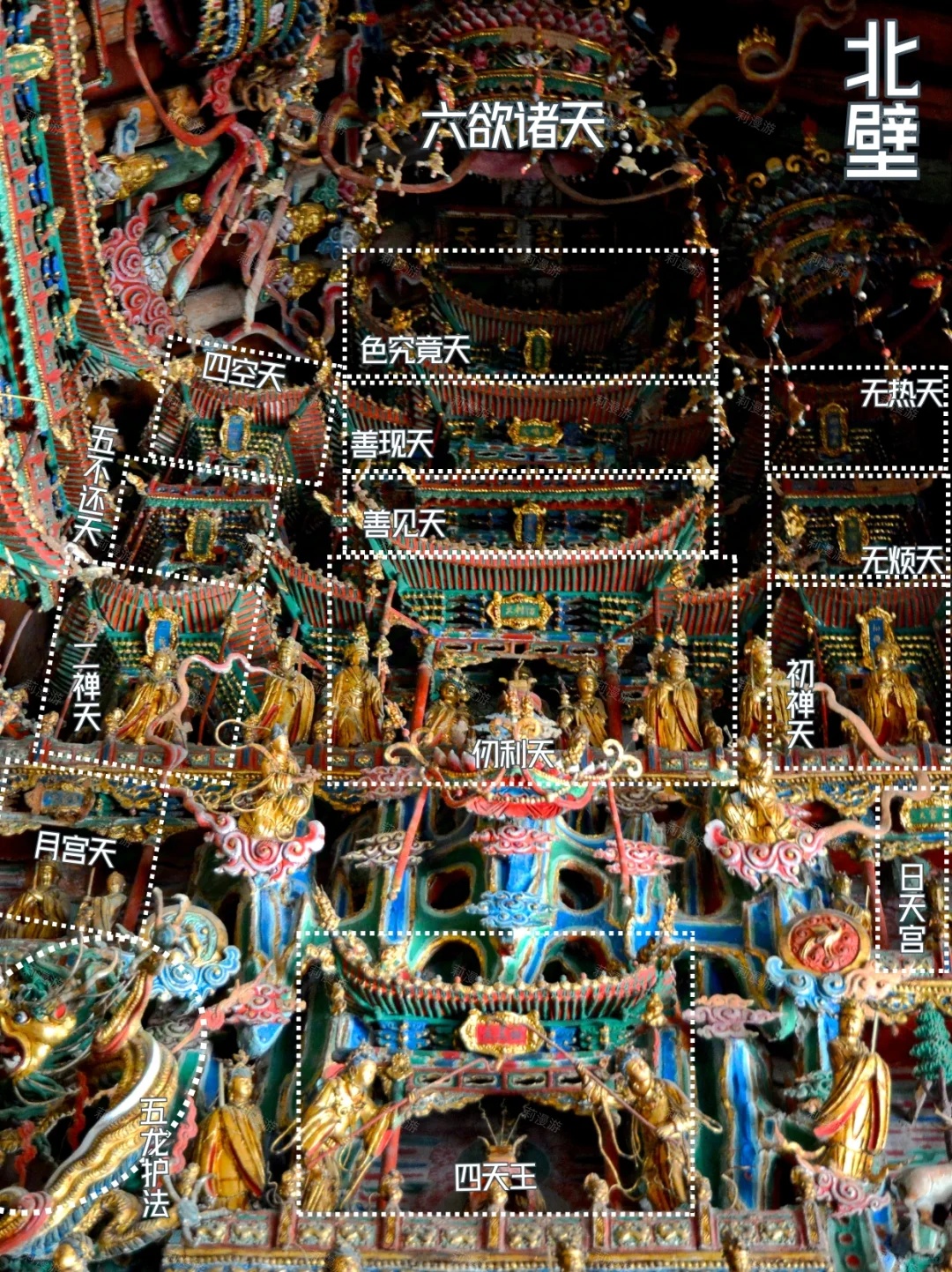3⃣️悬塑:也称壁塑,属于浮雕一类。南壁、北壁和和佛龛上方的层楼叠阁、各种人物,都属于悬塑