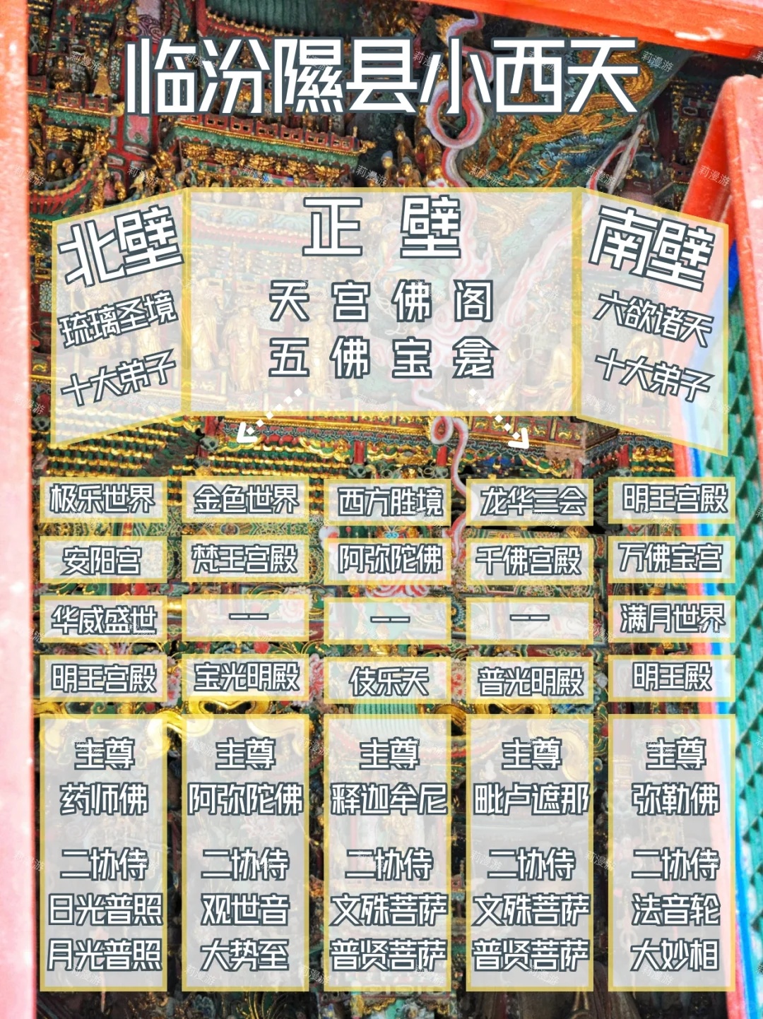 3⃣️悬塑:也称壁塑,属于浮雕一类。南壁、北壁和和佛龛上方的层楼叠阁、各种人物,都属于悬塑