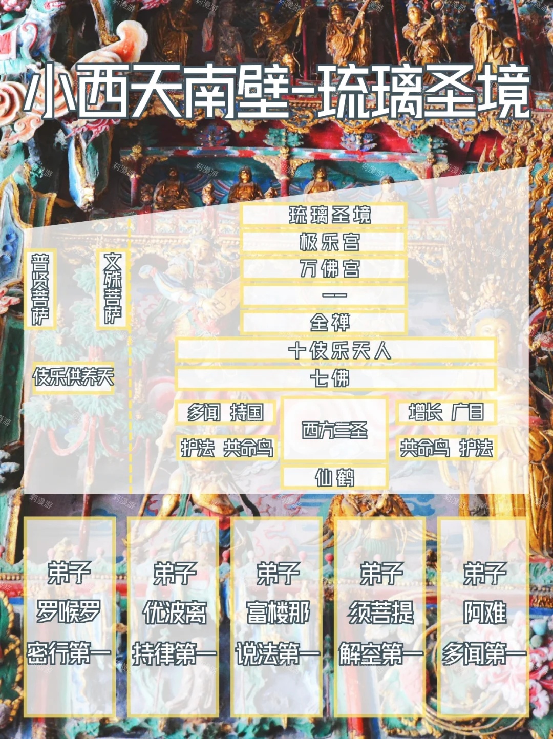 3⃣️悬塑:也称壁塑,属于浮雕一类。南壁、北壁和和佛龛上方的层楼叠阁、各种人物,都属于悬塑