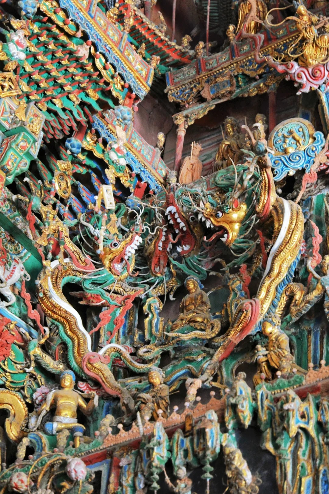 3⃣️悬塑:也称壁塑,属于浮雕一类。南壁、北壁和和佛龛上方的层楼叠阁、各种人物,都属于悬塑
