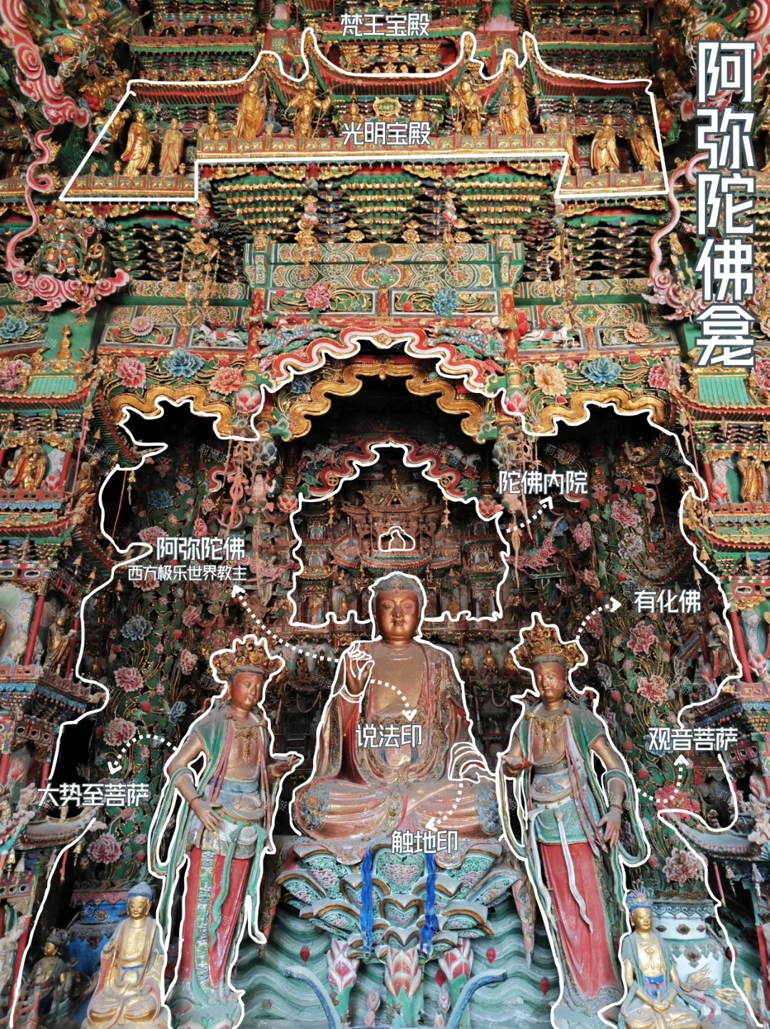 3⃣️悬塑:也称壁塑,属于浮雕一类。南壁、北壁和和佛龛上方的层楼叠阁、各种人物,都属于悬塑