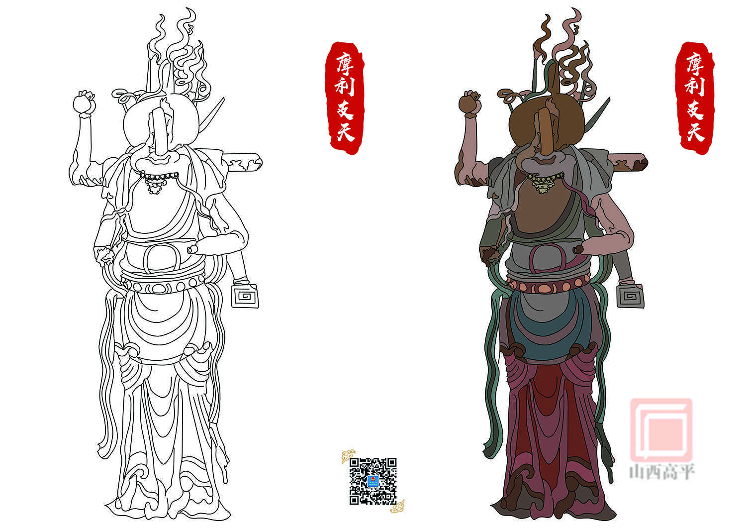 此尊造像为天女形象,头部遗失,上身袒露,身穿天衣,胸饰项圈。双肩的飘带环绕两臂游离体外飘落至脚边。有六臂,两臂上举,两臂在前,一臂手握法器,另一手臂残缺,造型与东面对应的大辩才天较为接近。 ------------------ <div><br></div>