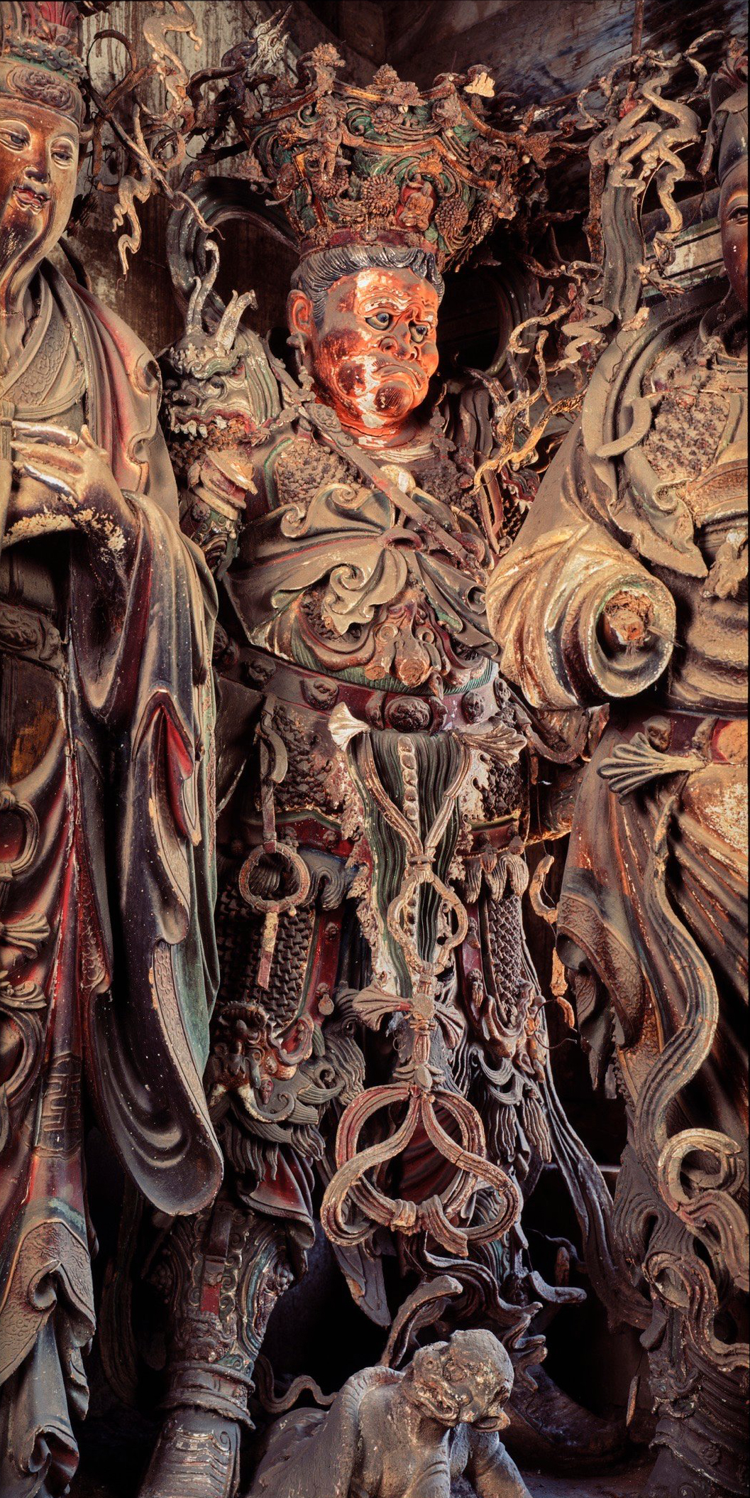 此尊造像头戴化佛华冠,锁眉怒目,双目圆鼓,凝视前方。身穿甲胄,腰挎宝剑,脚踩恶鬼,神态生动。