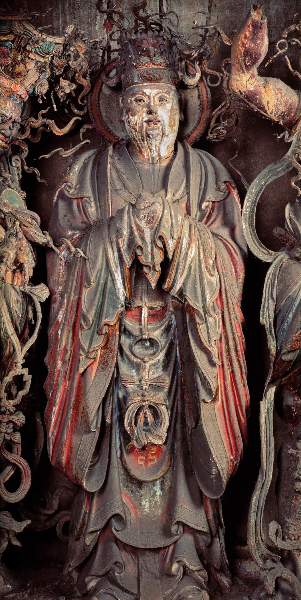 此尊造像为长眉长须之长者形象,头戴宝冠,面貌和悦,手捧帕巾,拱手而立,慈祥中透露出几分威严。身着广袖长衫,下身长裙及地,裙裾下露云头履。手中或原有持物,现已遗失。