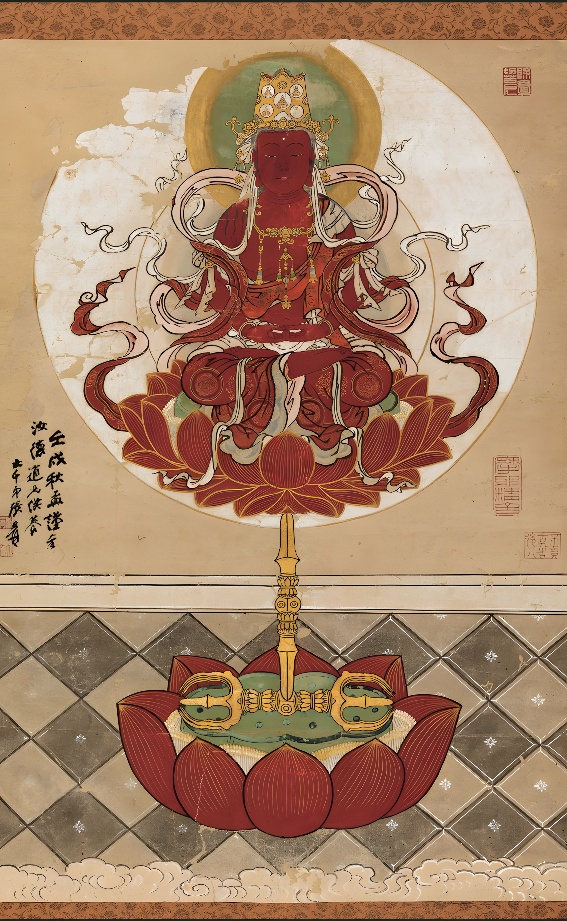 张大千临摹的敦煌壁画,涉及广泛,包罗万象,但此画的内容,却甚少见。此画绘的是早期的弥勒佛,现菩萨形,头戴五方佛宝冠,眉间有白毫,慈眉善目,法相庄严,面露微笑,双眼下视,身披轻妙天衣,衣上有团花图案,胸饰璎珞,臂戴宝钏,腕有手镯,彩带飞举,高贵华丽,双手放腹前结定印,结跏趺坐于金刚(杵)莲花宝座上。应当指出的是,这种金刚莲花座,属于佛教密宗,其形状十分特殊,象征着独一法界、金刚不坏、无坚不摧、佛法无边与所向无敌的佛陀智慧和真如佛性,可除去一切烦恼,并摧毁各种各样的恶魔。全画寓有慈悲、吉祥、未来、希望、和平、友谊、光明、智慧、长寿、发财、安乐、坚固、圆满等等许多美好的含意。此画在张大千临摹的敦煌壁画摹品中,很少见到。