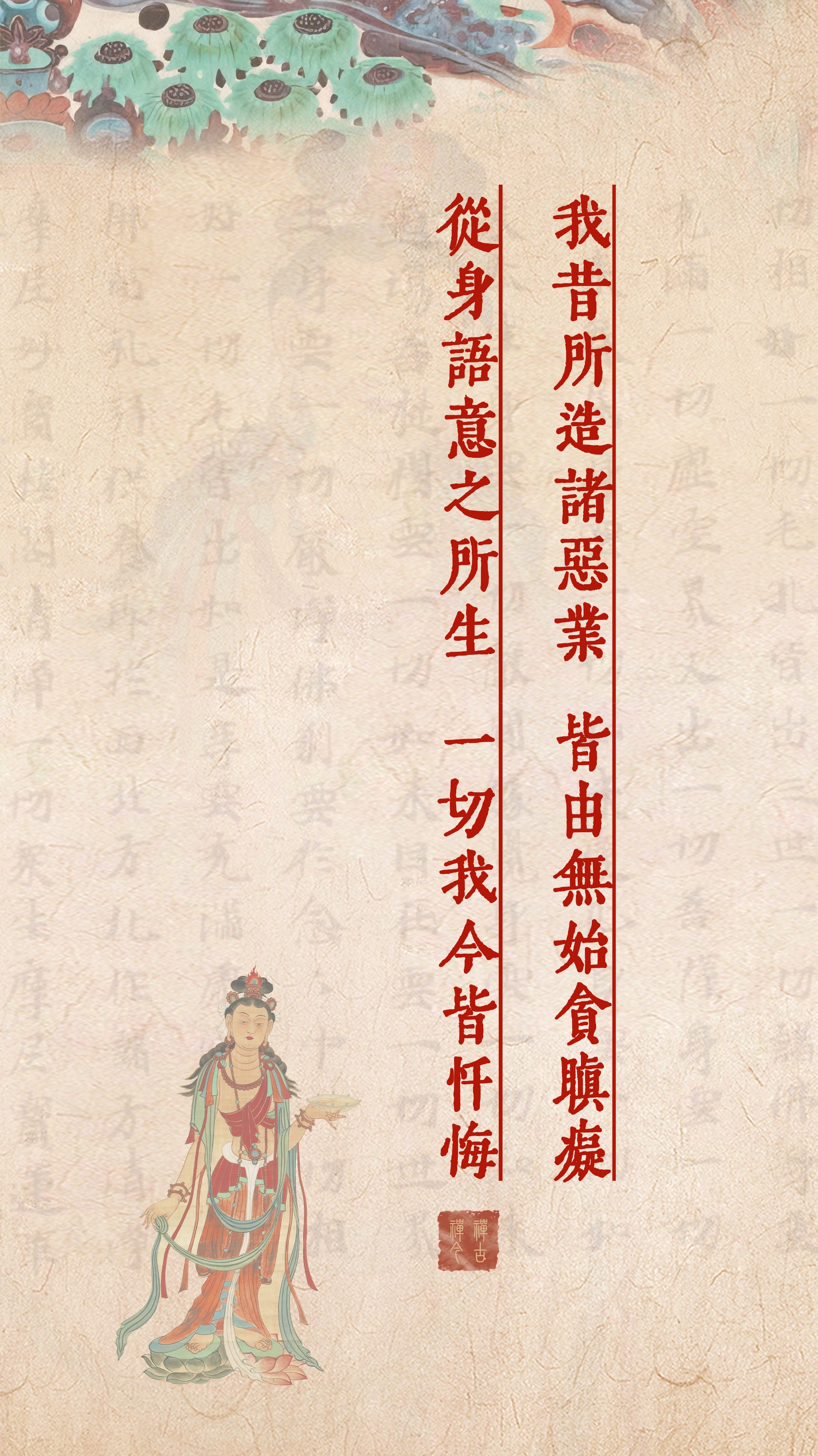 忏悔偈:我昔所做诸恶业.皆由无始贪嗔痴.从身语意之所生.一切我今皆忏悔.