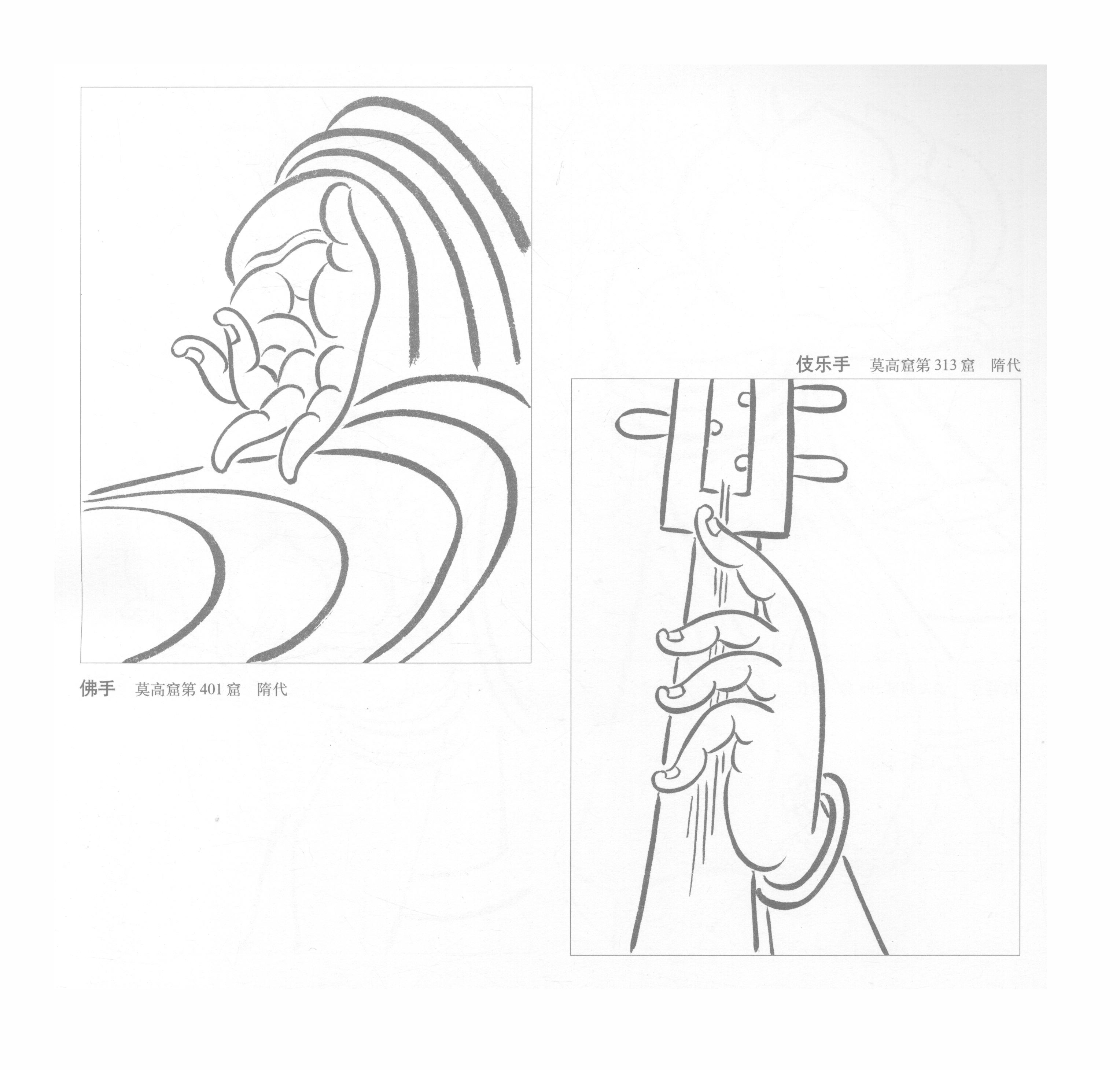 敦煌壁画中最具有代表性、最艺术化和是飞天、舞女、乐女和众多叫不出名称的菩萨的手,因为她们没有固定的司职、固定的风范及程式化的姿态,所以手势与手姿也就各不相同,一双(只)手配上各式的器物就可以变化无穷,百看不厌。