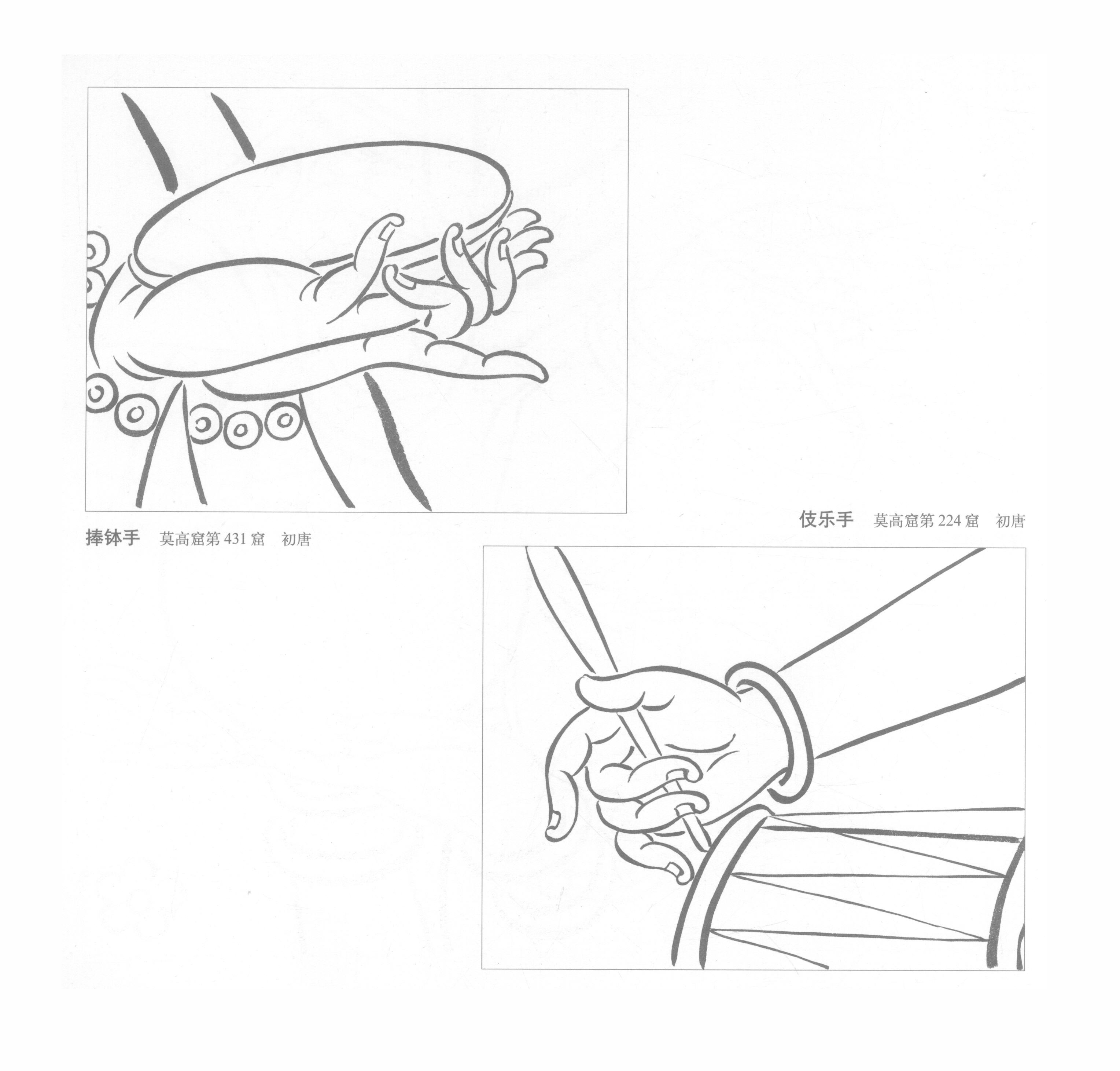 敦煌壁画中最具有代表性、最艺术化和是飞天、舞女、乐女和众多叫不出名称的菩萨的手,因为她们没有固定的司职、固定的风范及程式化的姿态,所以手势与手姿也就各不相同,一双(只)手配上各式的器物就可以变化无穷,百看不厌。
