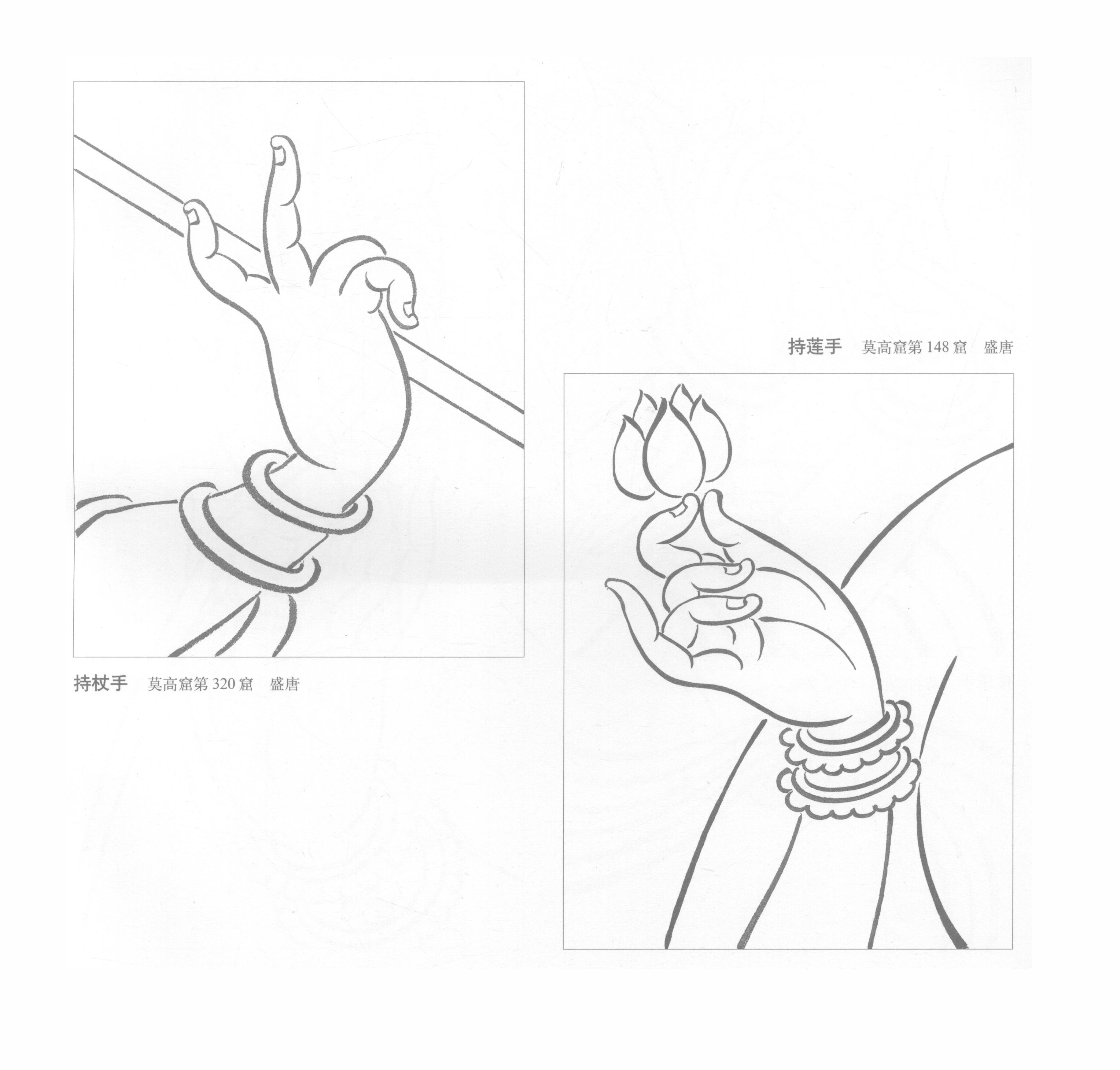 敦煌壁画中最具有代表性、最艺术化和是飞天、舞女、乐女和众多叫不出名称的菩萨的手,因为她们没有固定的司职、固定的风范及程式化的姿态,所以手势与手姿也就各不相同,一双(只)手配上各式的器物就可以变化无穷,百看不厌。