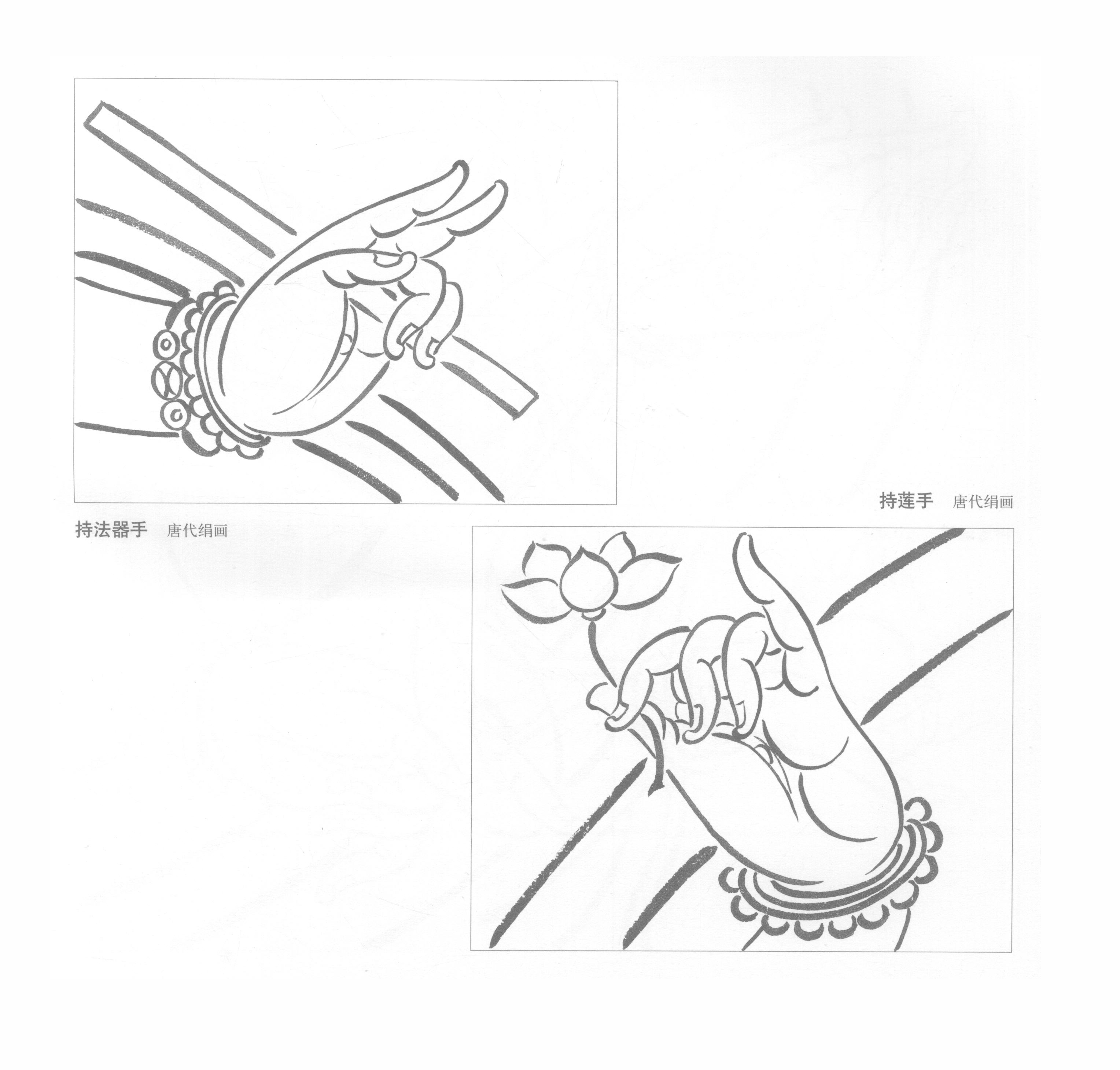 敦煌壁画中最具有代表性、最艺术化和是飞天、舞女、乐女和众多叫不出名称的菩萨的手,因为她们没有固定的司职、固定的风范及程式化的姿态,所以手势与手姿也就各不相同,一双(只)手配上各式的器物就可以变化无穷,百看不厌。