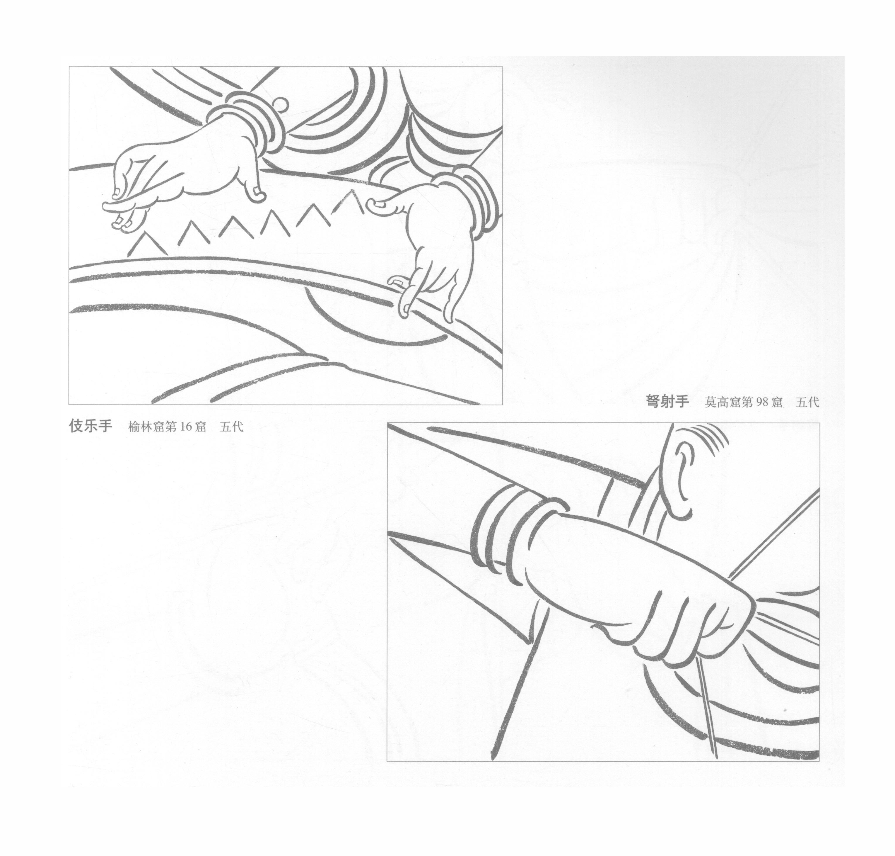 敦煌壁画中最具有代表性、最艺术化和是飞天、舞女、乐女和众多叫不出名称的菩萨的手,因为她们没有固定的司职、固定的风范及程式化的姿态,所以手势与手姿也就各不相同,一双(只)手配上各式的器物就可以变化无穷,百看不厌。