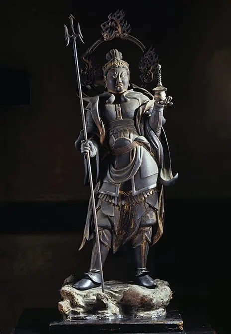 在京都三十三间堂中,以一尊高334.8cm的十一面千手观音坐像为中心,其制作于镰仓时代之建长6年(公元1254年),距今已有755年的历史,仍然保存完好。观音正反左右共计十一面,相貌表情各自区别,栩栩如生;42只本体之手各执法器,形体姿态优美,精雕细琢;头顶佛陀宝光圆通,庄严无比,震撼人心;舟形光背、千层莲台、豪华天盖,无不证明着此尊千手观音像,实乃佛教古代观音造像中的极品。千手观音之守护神风神、雷神,呈现半裸身形,造型夸张,筋骨毕露,充满着超自然力量的跃动感,风神肩抗风袋,雷神光背均为擂鼓,艺术表现手法极其生动。