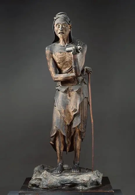 在京都三十三间堂中,以一尊高334.8cm的十一面千手观音坐像为中心,其制作于镰仓时代之建长6年(公元1254年),距今已有755年的历史,仍然保存完好。观音正反左右共计十一面,相貌表情各自区别,栩栩如生;42只本体之手各执法器,形体姿态优美,精雕细琢;头顶佛陀宝光圆通,庄严无比,震撼人心;舟形光背、千层莲台、豪华天盖,无不证明着此尊千手观音像,实乃佛教古代观音造像中的极品。千手观音之守护神风神、雷神,呈现半裸身形,造型夸张,筋骨毕露,充满着超自然力量的跃动感,风神肩抗风袋,雷神光背均为擂鼓,艺术表现手法极其生动。