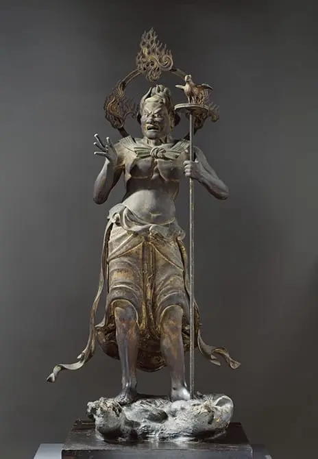 在京都三十三间堂中,以一尊高334.8cm的十一面千手观音坐像为中心,其制作于镰仓时代之建长6年(公元1254年),距今已有755年的历史,仍然保存完好。观音正反左右共计十一面,相貌表情各自区别,栩栩如生;42只本体之手各执法器,形体姿态优美,精雕细琢;头顶佛陀宝光圆通,庄严无比,震撼人心;舟形光背、千层莲台、豪华天盖,无不证明着此尊千手观音像,实乃佛教古代观音造像中的极品。千手观音之守护神风神、雷神,呈现半裸身形,造型夸张,筋骨毕露,充满着超自然力量的跃动感,风神肩抗风袋,雷神光背均为擂鼓,艺术表现手法极其生动。