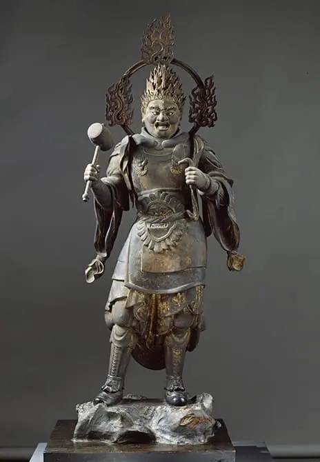 在京都三十三间堂中,以一尊高334.8cm的十一面千手观音坐像为中心,其制作于镰仓时代之建长6年(公元1254年),距今已有755年的历史,仍然保存完好。观音正反左右共计十一面,相貌表情各自区别,栩栩如生;42只本体之手各执法器,形体姿态优美,精雕细琢;头顶佛陀宝光圆通,庄严无比,震撼人心;舟形光背、千层莲台、豪华天盖,无不证明着此尊千手观音像,实乃佛教古代观音造像中的极品。千手观音之守护神风神、雷神,呈现半裸身形,造型夸张,筋骨毕露,充满着超自然力量的跃动感,风神肩抗风袋,雷神光背均为擂鼓,艺术表现手法极其生动。