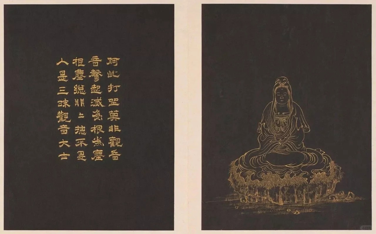 解说: 本册泥金画观世音菩萨三十二应身,原应有三十二幅,今仅存二十四幅。由于邢氏画册第四、六、七等幅的衣纹与身躯关系,交代得尚不及北京图书馆收藏的“观音相并颂”拓片刻本清楚,显示邢氏的“观世音菩萨三十二应身”并非传稿。邢氏之作、北京图书馆收藏的“观音相并颂”拓片,以及安徽省博物馆所藏“观音三十二相”版画的原版,皆依同样的稿本摹写或刻制,邢氏画上的题赞亦是抄录原来稿本上的偈语,并非她自己的创作。与“观音像并颂”比对,得知邢氏“观世音菩萨三十二应身”册缺漏的应是见龙观音、鱼篮观音、提篮观音、观音与龙女等八幅。全册人物除了第二十三幅观音作佛身,现男相,馀皆为女相观音。其或正或背,或坐磬石,或乘莲瓣、鳖鱼、犼等,身侧时有善财童子与莺哥的出现。全作以金代墨,线条柔畅。每幅均题三十二字赞语一首(略)。