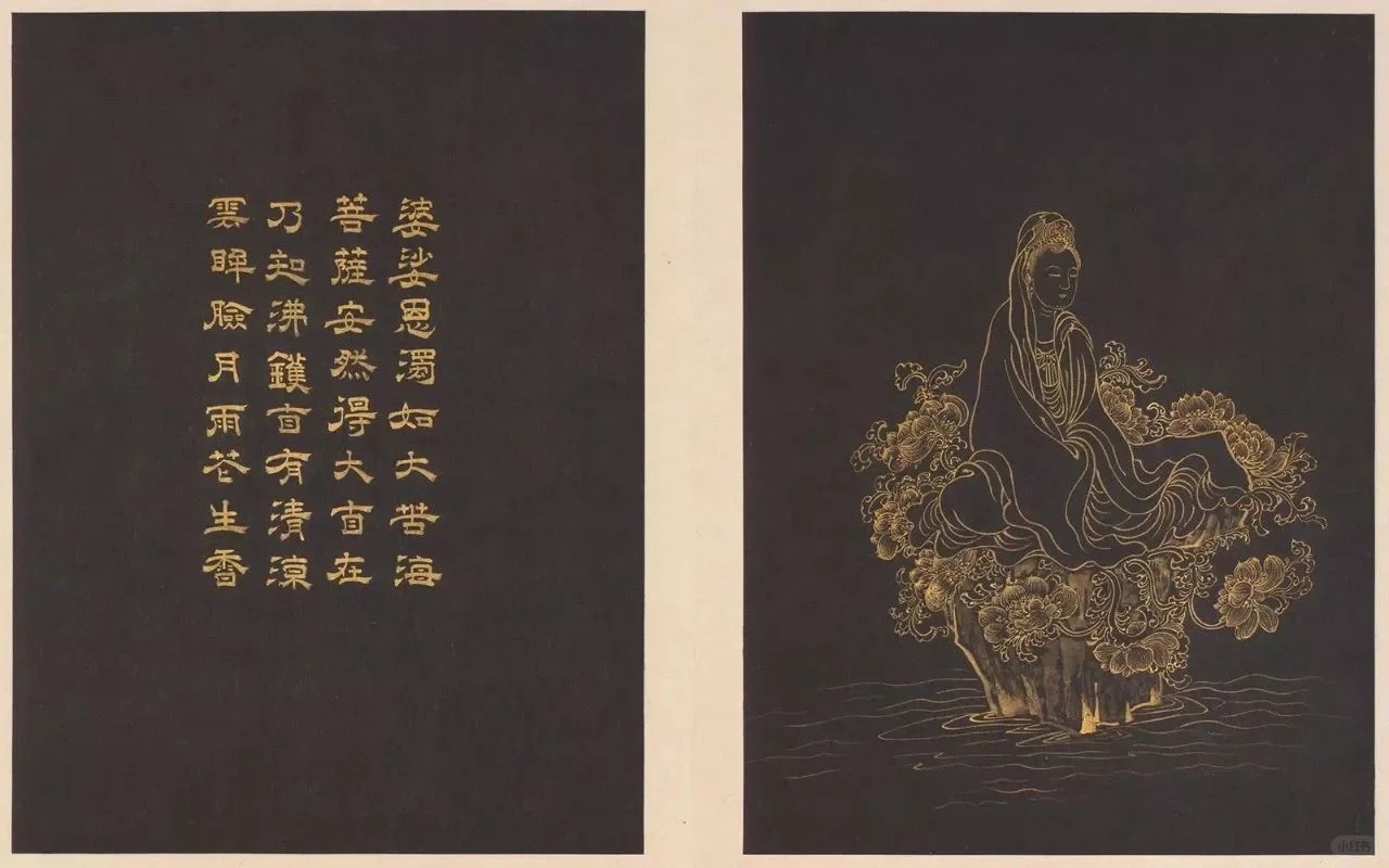 解说: 本册泥金画观世音菩萨三十二应身,原应有三十二幅,今仅存二十四幅。由于邢氏画册第四、六、七等幅的衣纹与身躯关系,交代得尚不及北京图书馆收藏的“观音相并颂”拓片刻本清楚,显示邢氏的“观世音菩萨三十二应身”并非传稿。邢氏之作、北京图书馆收藏的“观音相并颂”拓片,以及安徽省博物馆所藏“观音三十二相”版画的原版,皆依同样的稿本摹写或刻制,邢氏画上的题赞亦是抄录原来稿本上的偈语,并非她自己的创作。与“观音像并颂”比对,得知邢氏“观世音菩萨三十二应身”册缺漏的应是见龙观音、鱼篮观音、提篮观音、观音与龙女等八幅。全册人物除了第二十三幅观音作佛身,现男相,馀皆为女相观音。其或正或背,或坐磬石,或乘莲瓣、鳖鱼、犼等,身侧时有善财童子与莺哥的出现。全作以金代墨,线条柔畅。每幅均题三十二字赞语一首(略)。