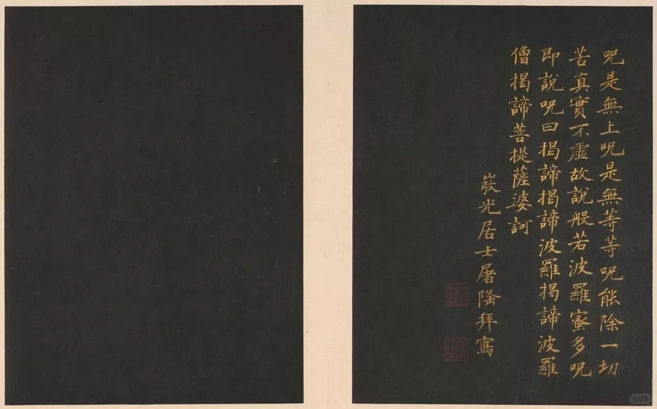 解说: 本册泥金画观世音菩萨三十二应身,原应有三十二幅,今仅存二十四幅。由于邢氏画册第四、六、七等幅的衣纹与身躯关系,交代得尚不及北京图书馆收藏的“观音相并颂”拓片刻本清楚,显示邢氏的“观世音菩萨三十二应身”并非传稿。邢氏之作、北京图书馆收藏的“观音相并颂”拓片,以及安徽省博物馆所藏“观音三十二相”版画的原版,皆依同样的稿本摹写或刻制,邢氏画上的题赞亦是抄录原来稿本上的偈语,并非她自己的创作。与“观音像并颂”比对,得知邢氏“观世音菩萨三十二应身”册缺漏的应是见龙观音、鱼篮观音、提篮观音、观音与龙女等八幅。全册人物除了第二十三幅观音作佛身,现男相,馀皆为女相观音。其或正或背,或坐磬石,或乘莲瓣、鳖鱼、犼等,身侧时有善财童子与莺哥的出现。全作以金代墨,线条柔畅。每幅均题三十二字赞语一首(略)。