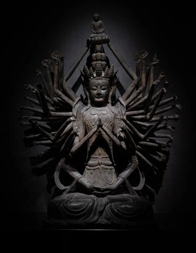 这是一尊明代铜鎏金千手观音,收藏在山东省博物馆。 这尊千手观音像令人为震撼,十一张面孔分五层排列,主面孔塑造得十分慈祥。四十八手或执法器或施手印,手中还少见地刻有法眼。 整体设计错落有致、制作工艺十分复杂,艺术感极强。