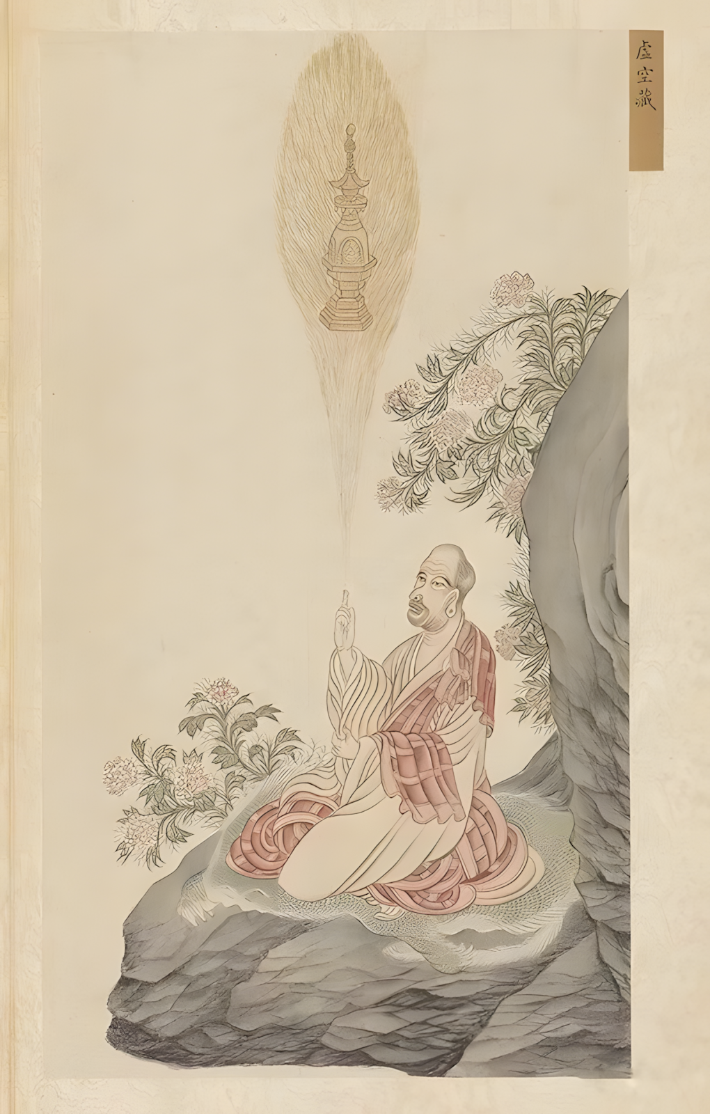 虚空藏菩萨。即从座起。顶礼佛足。而白佛言。我与如来。定光佛所。得无边身。尔时。手执四大宝珠。照明十方微尘佛刹。化成虚空。又于自心现大圆镜。内放十种微妙宝光。流灌十方。尽虚空际。诸幢王刹。来入镜内。涉入我身。身同虚空。不相妨碍。身能善入微尘国土。广行佛事。得大随顺。此大神力。由我谛观。四大无依。妄想生灭。虚空无二。佛国本同。于同发明。得无生忍。佛问圆通。我以观察虚空无边。入三摩地。妙力圆明。斯为第一。