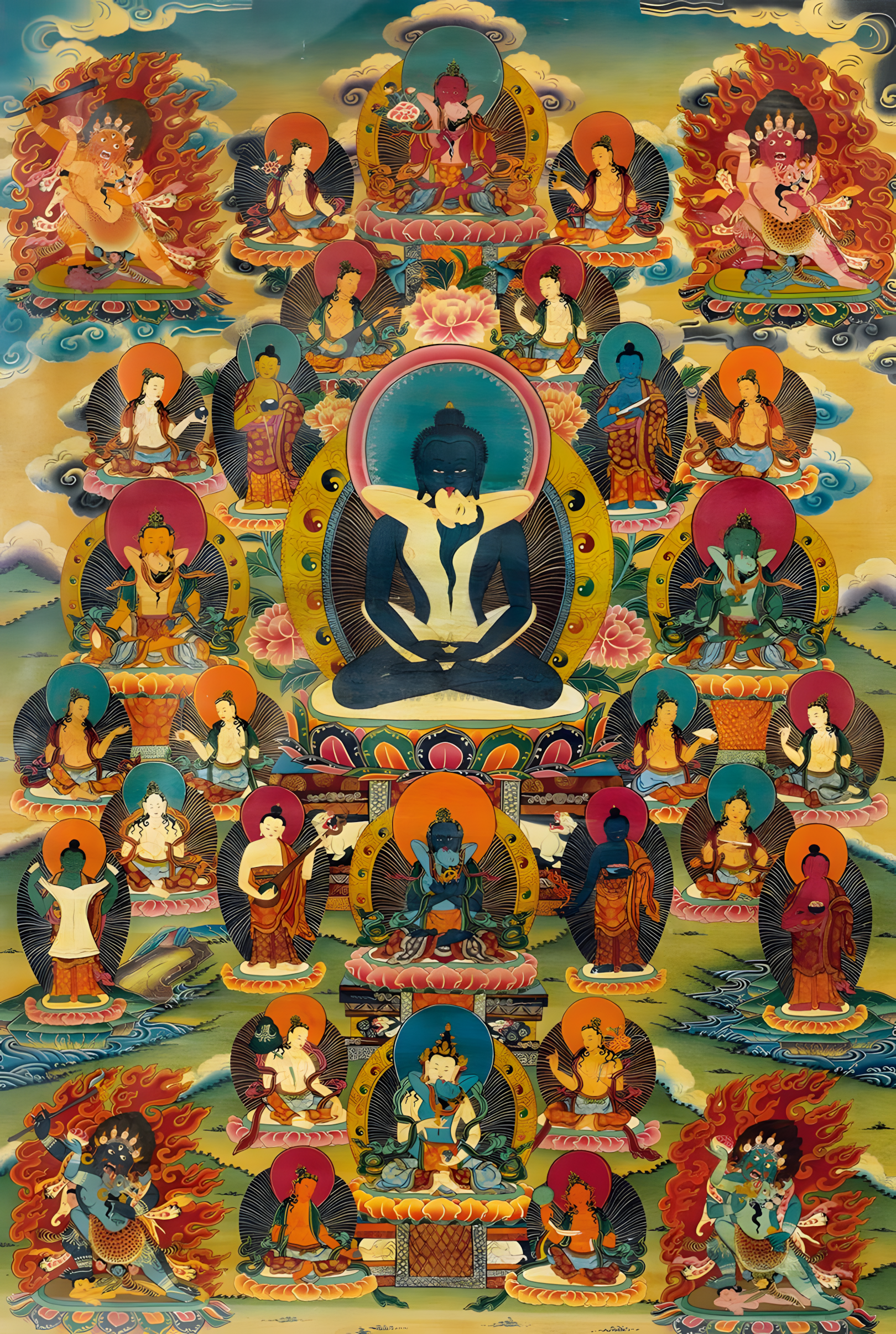设色绢本 镜框 简介:此幅绘普贤王如来主尊,为藏密宁玛派皈依境之主,称其为原始佛。法身普贤王如来,法尔一念,传于自性之五方五佛,如此自明体之眷属,寂念圣者之坛城,无数明显之示现,开示法性不可思议之真谛,远离一切言诠,加持通达空性之智慧。普贤王如来亦表自身清净佛性,难以诠说,亦无显观,故以虚空无量之蓝色肤为表,并以裸身无衣表其法尔本质,与普贤王佛母观双运相,表空乐不二,密宗以方便为父,般若为母,故此为悲智双运之表征。