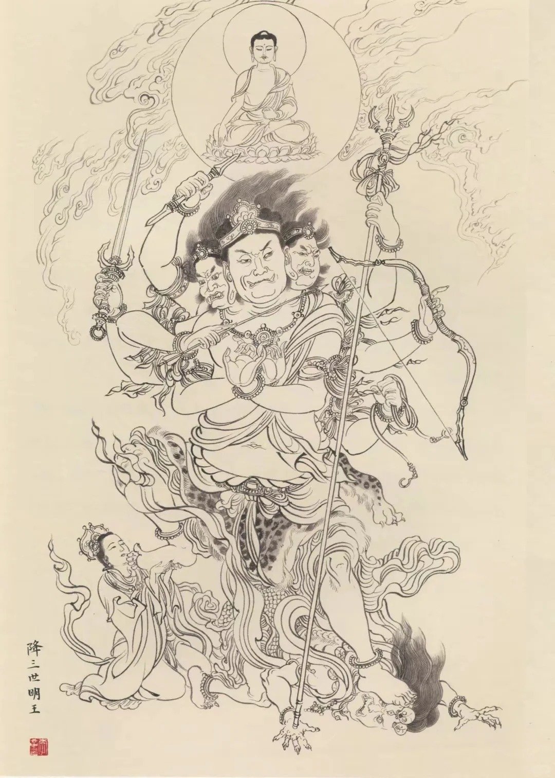 “明王”为梵文“Vidyā-rāja”的意译,“明”即光明,寓以佛智的光明,破除众生的愚痴烦恼之意。明王是佛教密宗对示现愤怒威猛相,多面多臂、手持各种法物降服恶魔之诸尊、菩萨的通称。