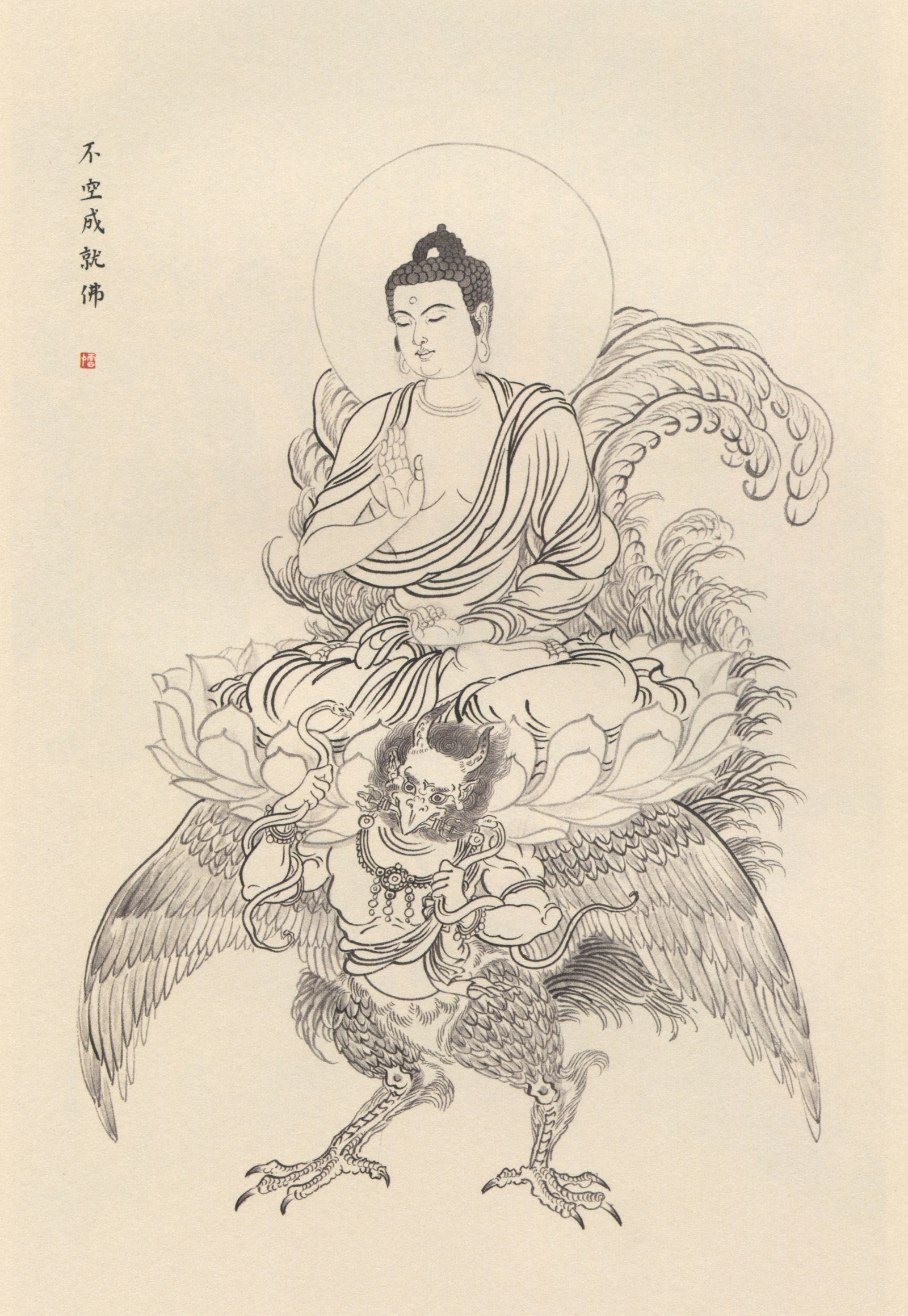 不空成就佛为密宗五方佛之一, 意即成就一切的智慧。 供奉此佛能行多种“行愿”, 达成多种目的。 本图所绘, 如来肉髻高耸, 俯瞰众生。 左手执衣两角, 右手展掌竖五指,当肩向外, 此手印名 “施无畏印”, 乃为救度有情众生与成就佛法功德之姿势。莲座由一 “桑桑鸟” 所抬。 此鸟长角, 具人身、 鸟翼。 双手执蛇, 象征对 “嫉妒” 的降伏。 <br>