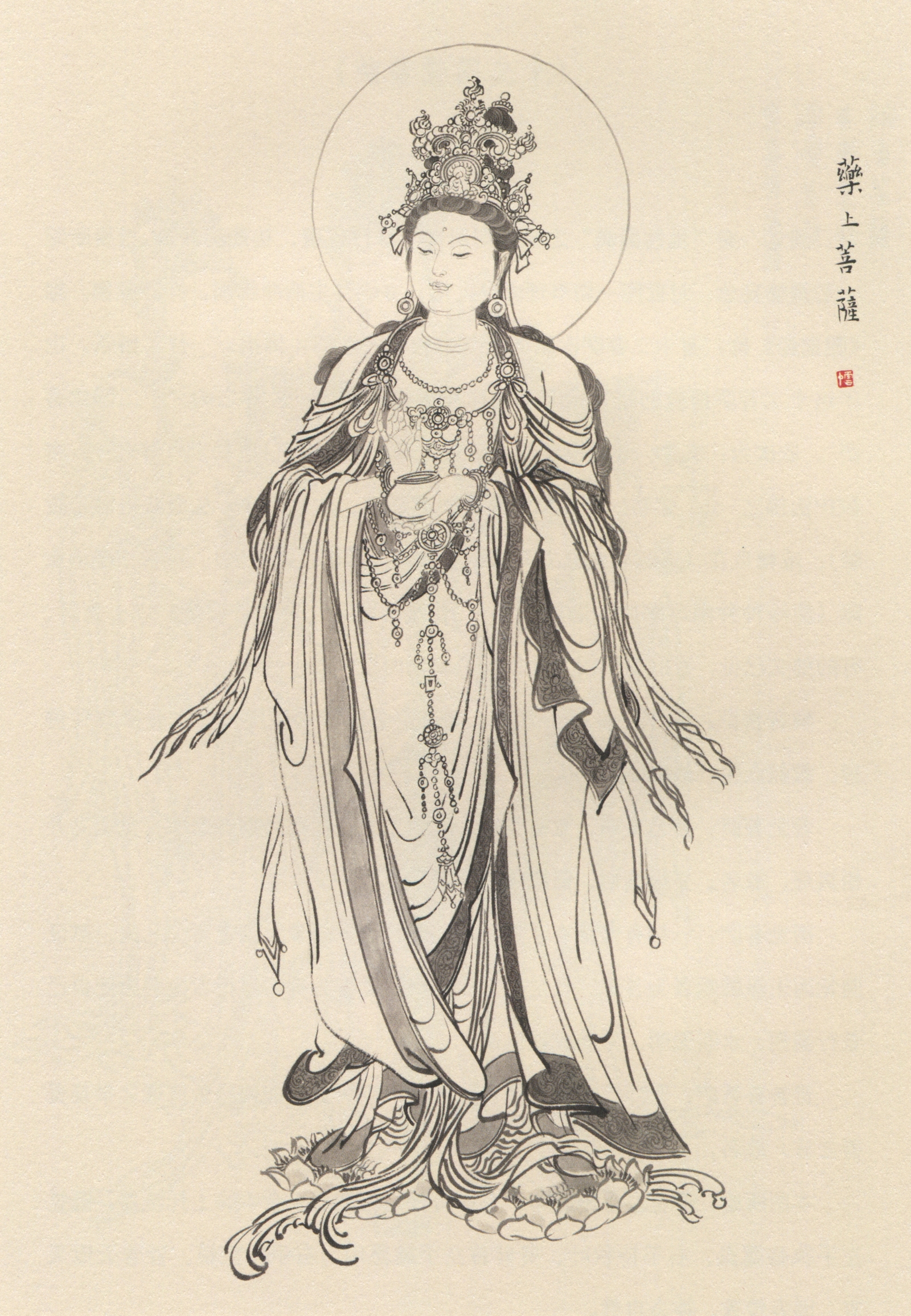 药上菩萨, 与药王菩萨系两兄弟,药上为弟,名电光明; 有时取代普贤菩萨, 被作为释迦牟尼佛的右胁侍。 佛陀预言其将在未来世成佛, 号净藏如来。 药上效学其兄, 亦以药力祛除四大增损及烦恼, 嗔恚二病。 因此药故,大众皆发菩提心, 于未来世皆当成佛。 本图绘菩萨天人装扮,头戴宝冠,身挂璎珞,手托药钵, 脚踩双莲。