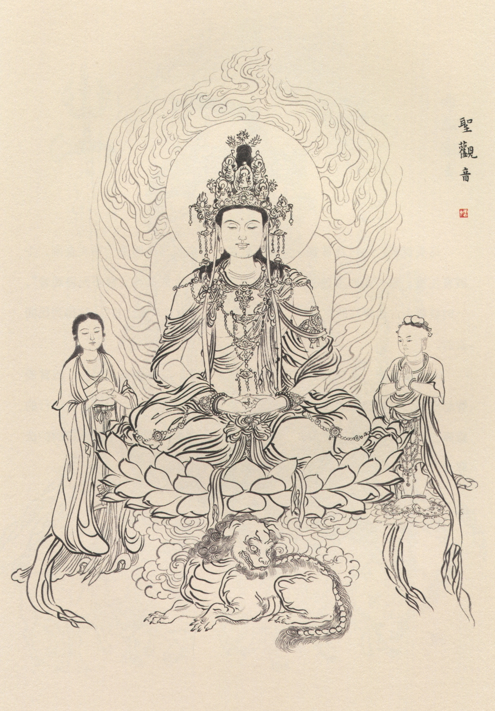圣观音又称正观音,为观世音菩萨本身相, 是菩萨各种法相的总体代表。菩萨其他应化身, 都是从正观音形象演变而来, 以观音为主尊之 “大士殿”“圆通殿” 即供奉此像。 主破饿鬼道三障, 而此道最为饥渴,宜用大慈, 故又称 “大慈观音”。 本图绘菩萨法相端庄、 慈祥、悲悯。 头戴毗卢冠, 结跌坐于莲花座上,双手放在胸前腿上结法界定印。 乃观世音菩萨 “标准像”, 现普陀山法雨寺主尊即按此。