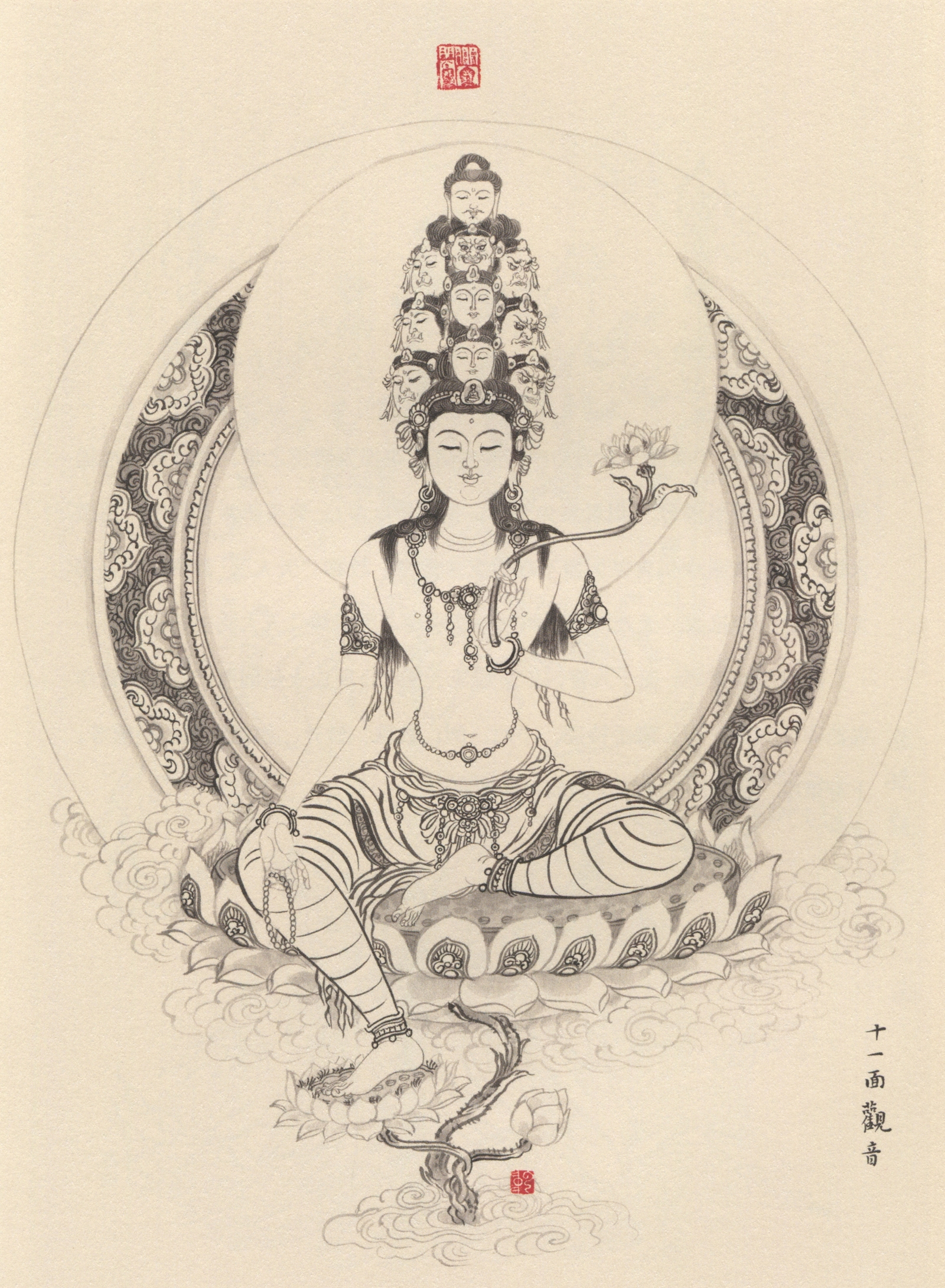 本图绘菩萨一手执莲, 一手执念珠, 半趺坐于莲花上。 十一面分五层排列: 正中善面, 化恶有情; 二面慈面, 化善有情; 三面寂静面, 化出世净业,这三面教化三界便成九面。第十面暴恶面, 表教化需极大威严、 极大意志方能有成; 最上为佛面, 表功德圆满。 一说其十一个头面以十面象征十地因位 (菩萨修行层次), 最上一面象征十一地佛果 。