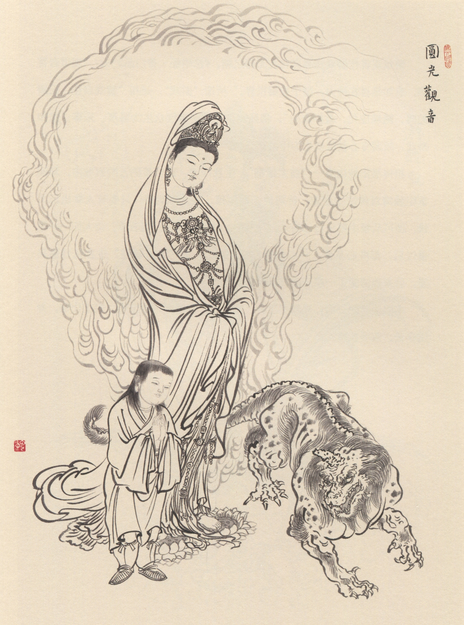 本图绘菩萨背光烈焰, 站立于莲花上。 旁有童子合十、 怪兽低首作驯服状, 讲的就是这一出典。