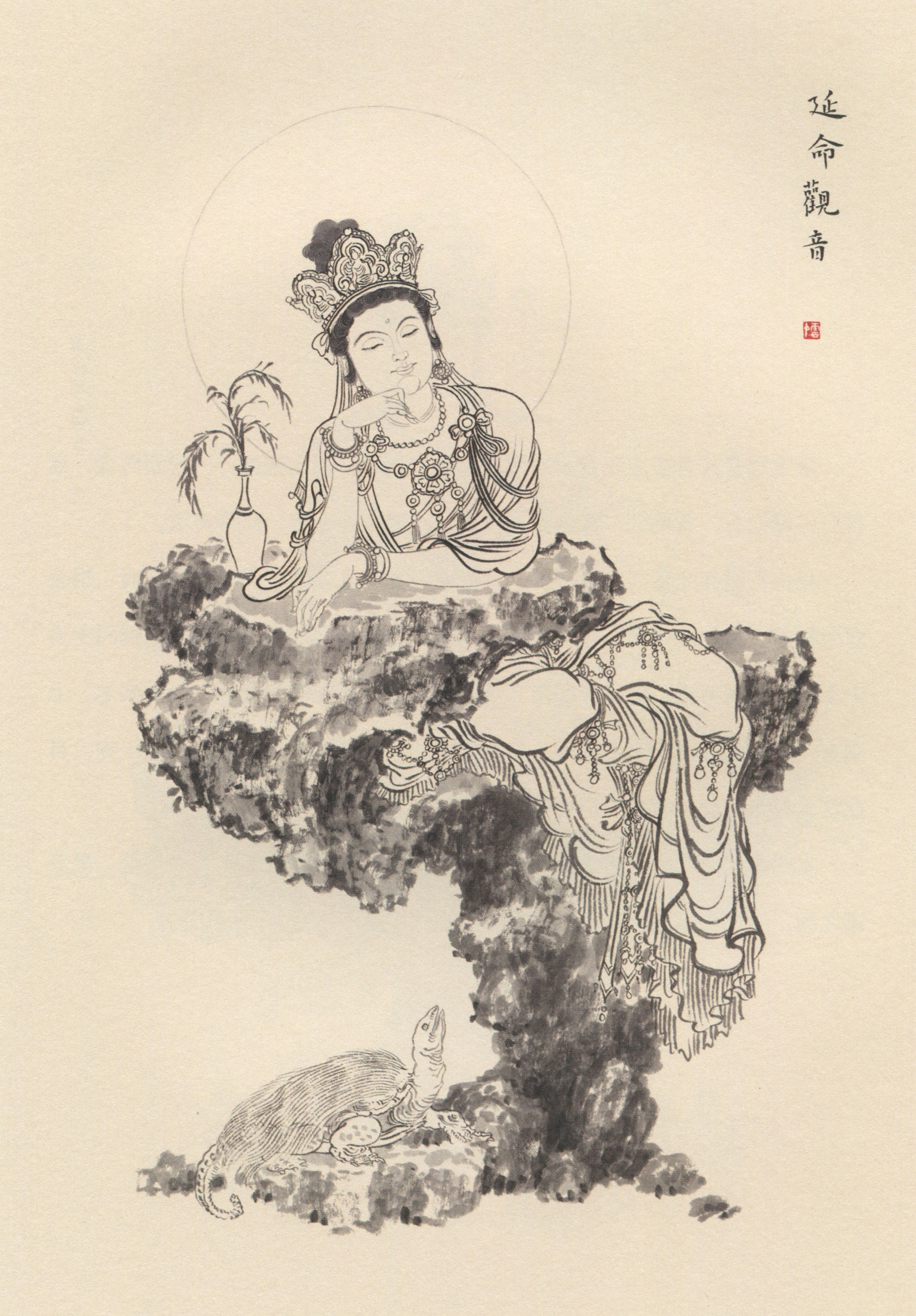 本图绘菩萨头戴天冠,一手支颐, 旁净瓶中插有柳枝,安详半躺于岩上。岩下有龟听法,龟者,长寿象征也。