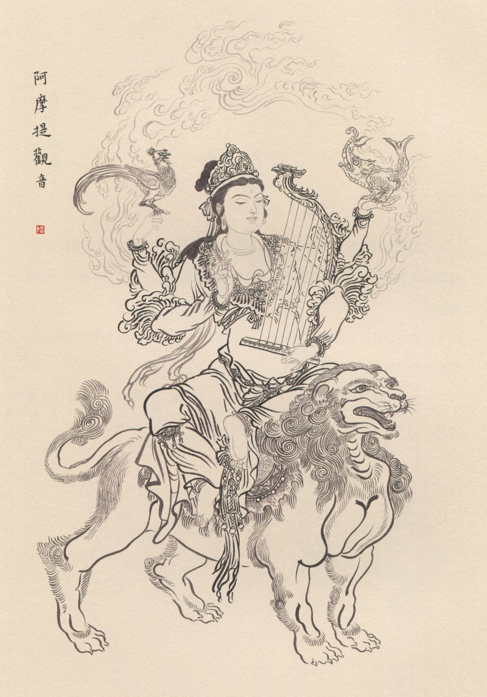 阿摩提, 又译阿马拉瓦蒂, 意译无畏, 故阿摩提观音又称狮子无畏观音。因此菩萨乘白狮与毗沙门天王同, 或释为表毗沙门身。《法华经 · 普门品》 云:‘应以毗沙门身得度者, 即现毗沙门身而为说法。” 能使众生生无畏无惧之心。 本图绘菩萨乘白狮, 一首四臂: 三臂分持摩羯鱼、 白吉祥鸟、 凤头箜篌,一手结说法印, 背光火焰,亦为密宗所奉。