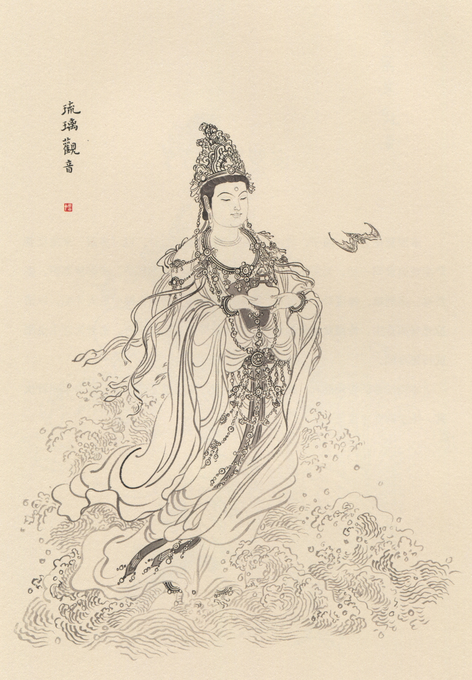 琉璃观音又称高王观音、 香王观音等。 传说有二: 一说有一峰和尚, 云游四海, 宣扬佛法。一次来到东海之滨, 欲找奇石雕刻观音圣像, 忽见海面飘来一尊琉璃观音像, 即刻捞起, 送至附近寺庙供奉。