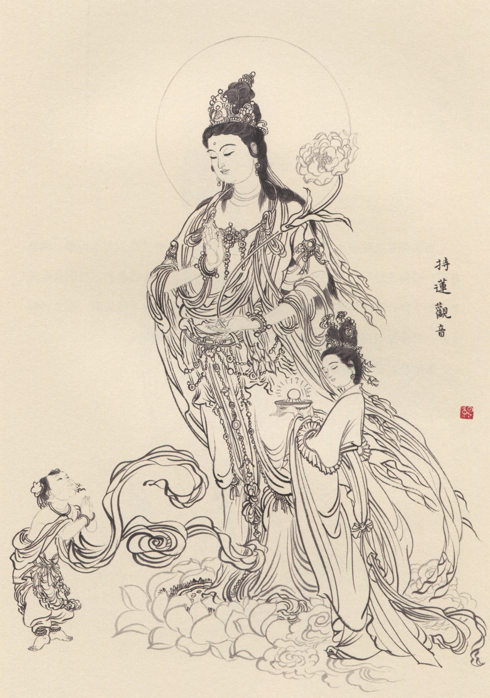 持莲观音, 因手持莲花故名。 源于菩萨教化善财童子时之法相。 手执大白莲花, 合 《妙法莲华经》 之名。 又陪侍之童男、 童女以莲花之花蕾喻之, 意即怀着纯净菩提心的菩萨期待花儿盛开 (速成功德)。 本图绘菩萨天人装束, 执莲观望童子 (善财) 作殷殷期待状, 旁有童女(龙女) 捧珠侍立。