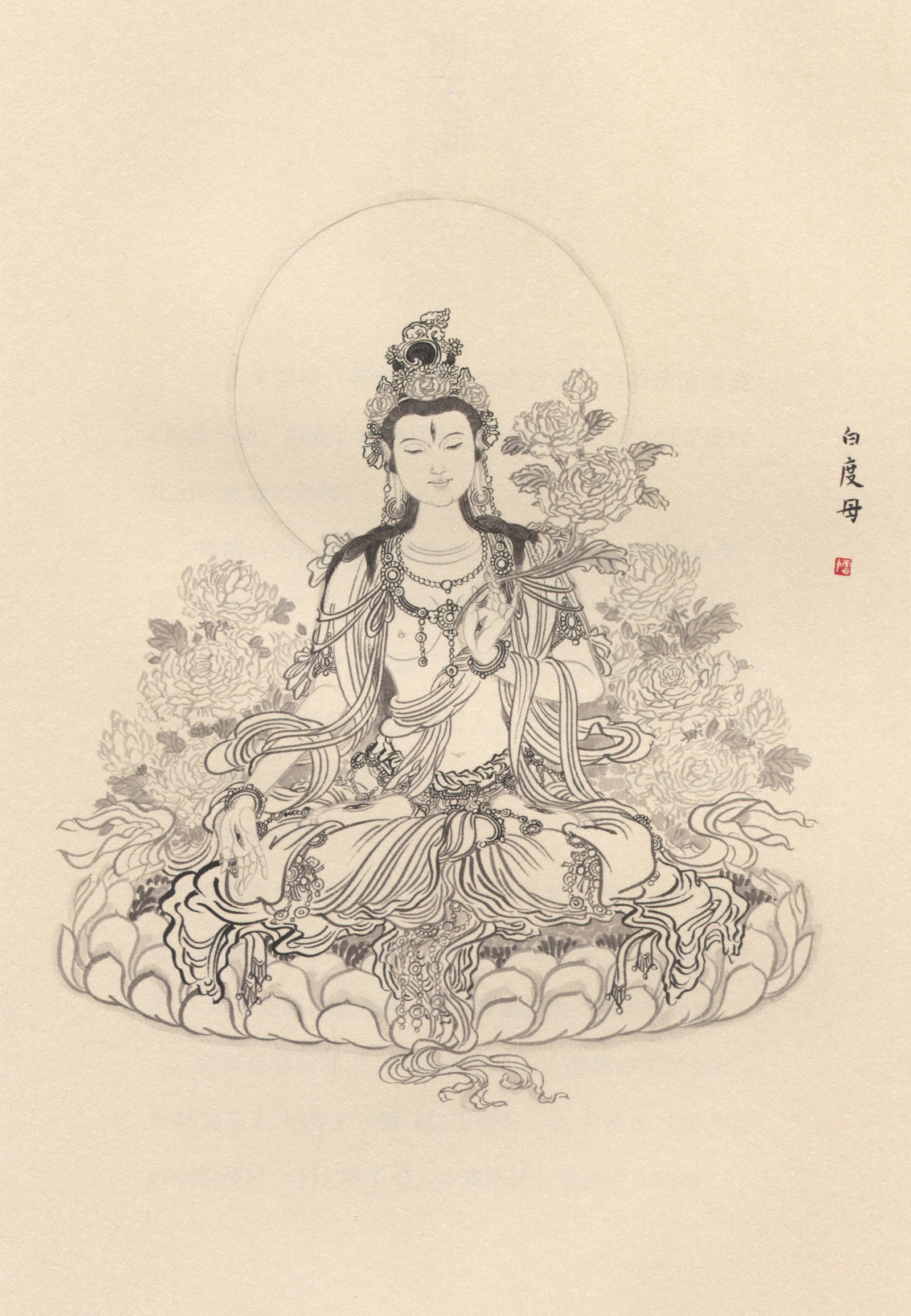 白度母, 又称增寿救度佛母,与绿度母共为二十一尊度母中流传最广者。 藏密常以其与长寿佛、 尊胜佛母合称为 “长寿三尊”。 因其面、 手、 脚共有七目, 所以又称 “七眼佛母”: 额上一目观十方无量佛土, 其余六目观六道众生。 本图所绘,度母一面七目,头戴花蔓冠, 双耳坠环, 颈挂珠宝璎珞。左手当胸结三宝印捻乌巴拉花, 花有三朵,一朵含苞,一朵半开,一朵全开, 表佛、 法、 僧三宝具足;右手结施愿印。 双足呈金刚跏趺坐于莲花月轮上。