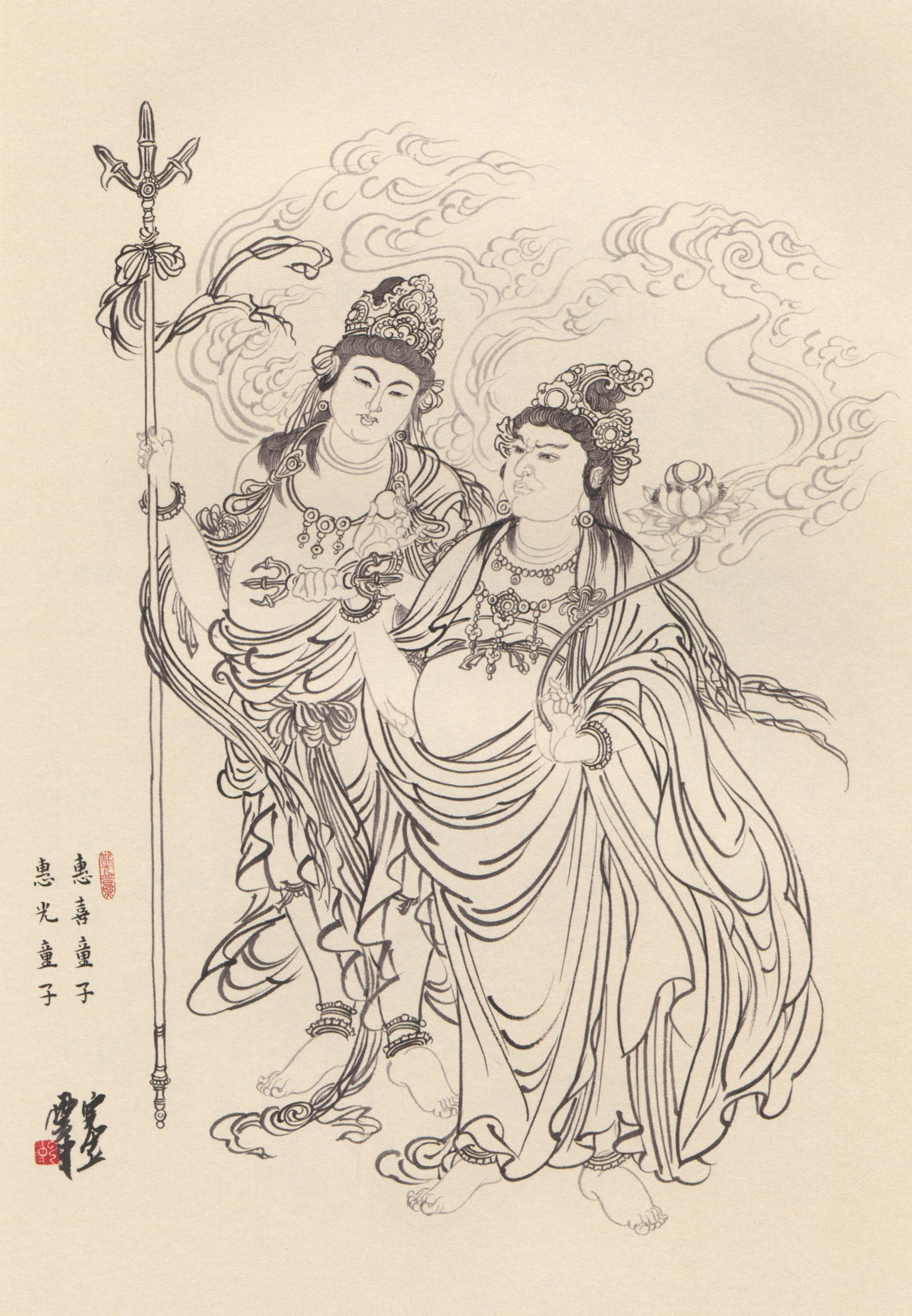 慧喜童子亦天人打扮,左手执莲花,上有日月轮,右手执金刚。