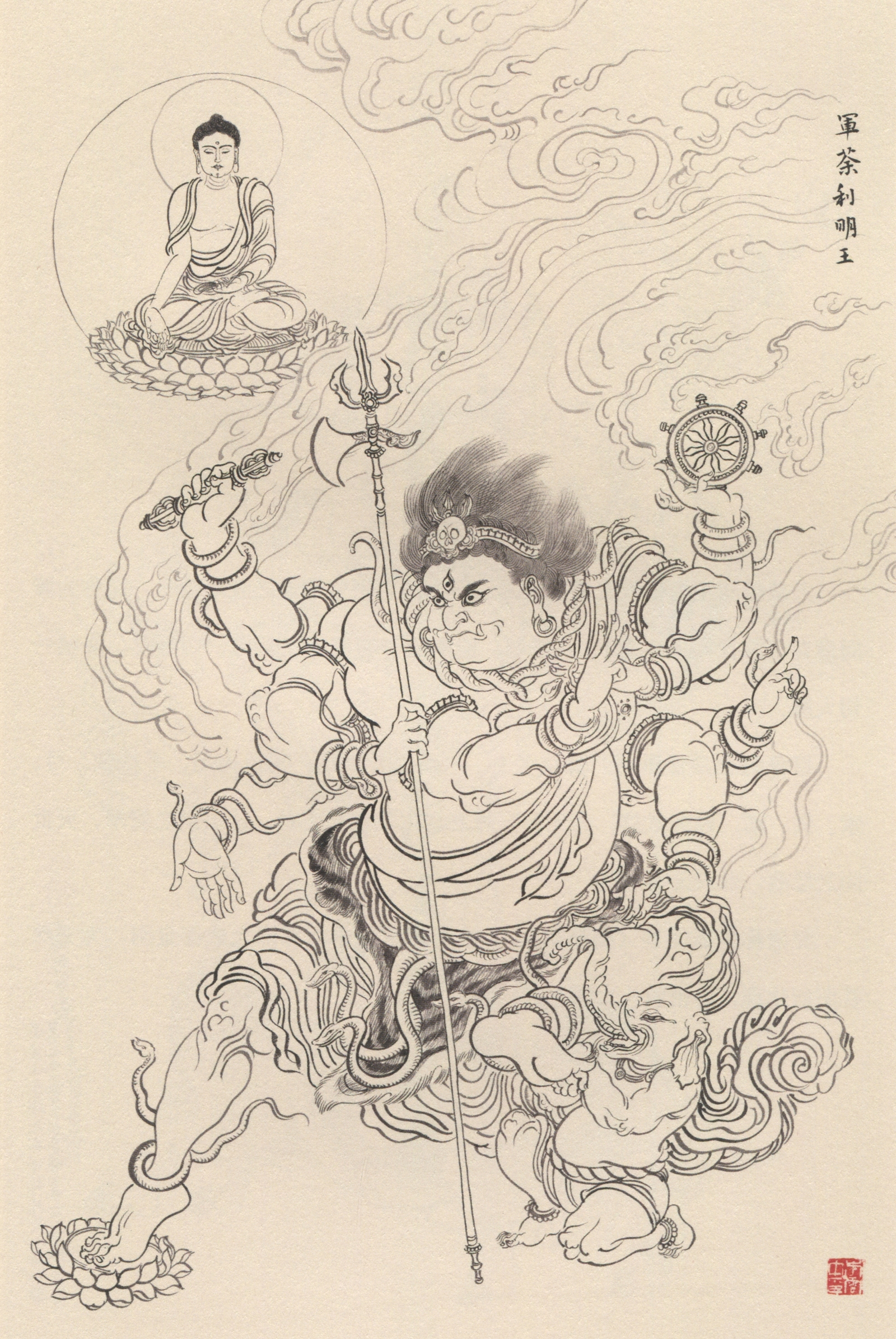 军荼利明王为密教五大明王之一, 为南方宝生佛之教令轮身。“军荼利”意译为 “瓶”, 在密教, 瓶象征甘露, 喻明王以大威日轮照耀修行者, 流注甘露水洗涤众生之心; 又因其形貌似夜叉身, 因此又称为甘露军荼利明王或军茶利夜叉明王。