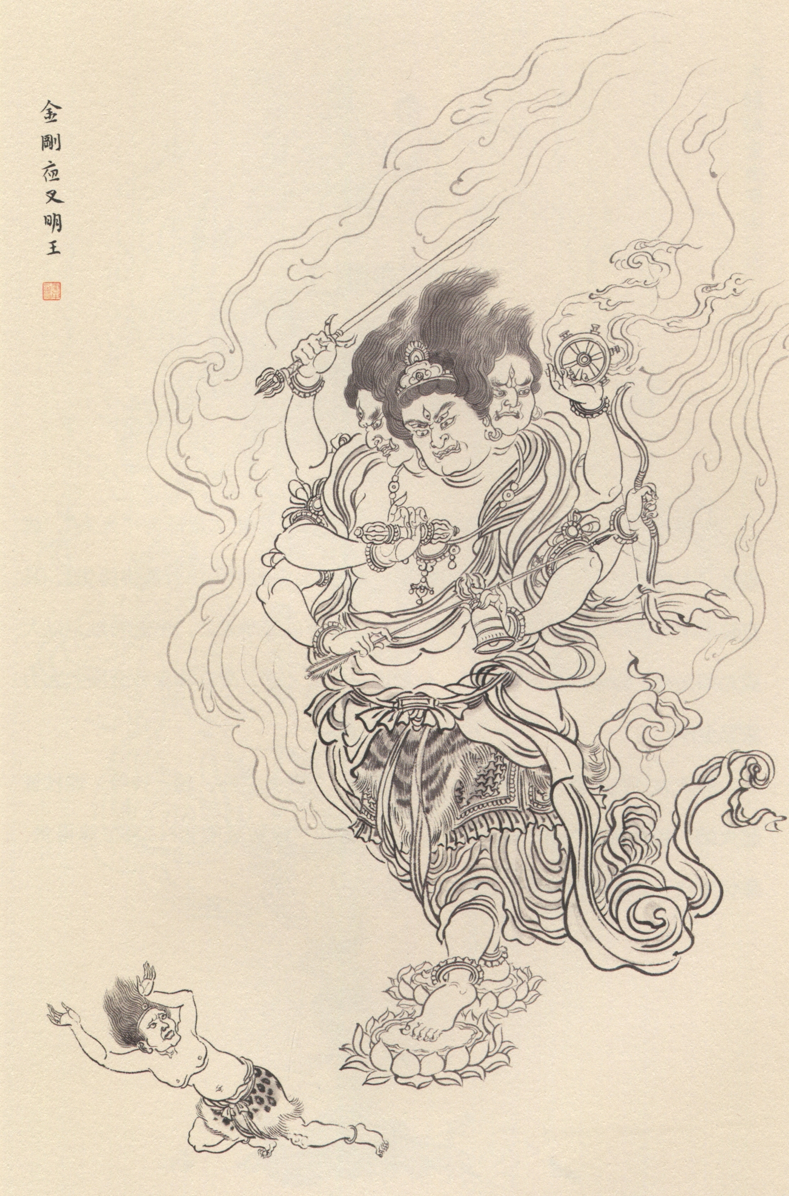 “明王”为梵文“Vidyā-rāja”的意译,“明”即光明,寓以佛智的光明,破除众生的愚痴烦恼之意。明王是佛教密宗对示现愤怒威猛相,多面多臂、手持各种法物降服恶魔之诸尊、菩萨的通称。