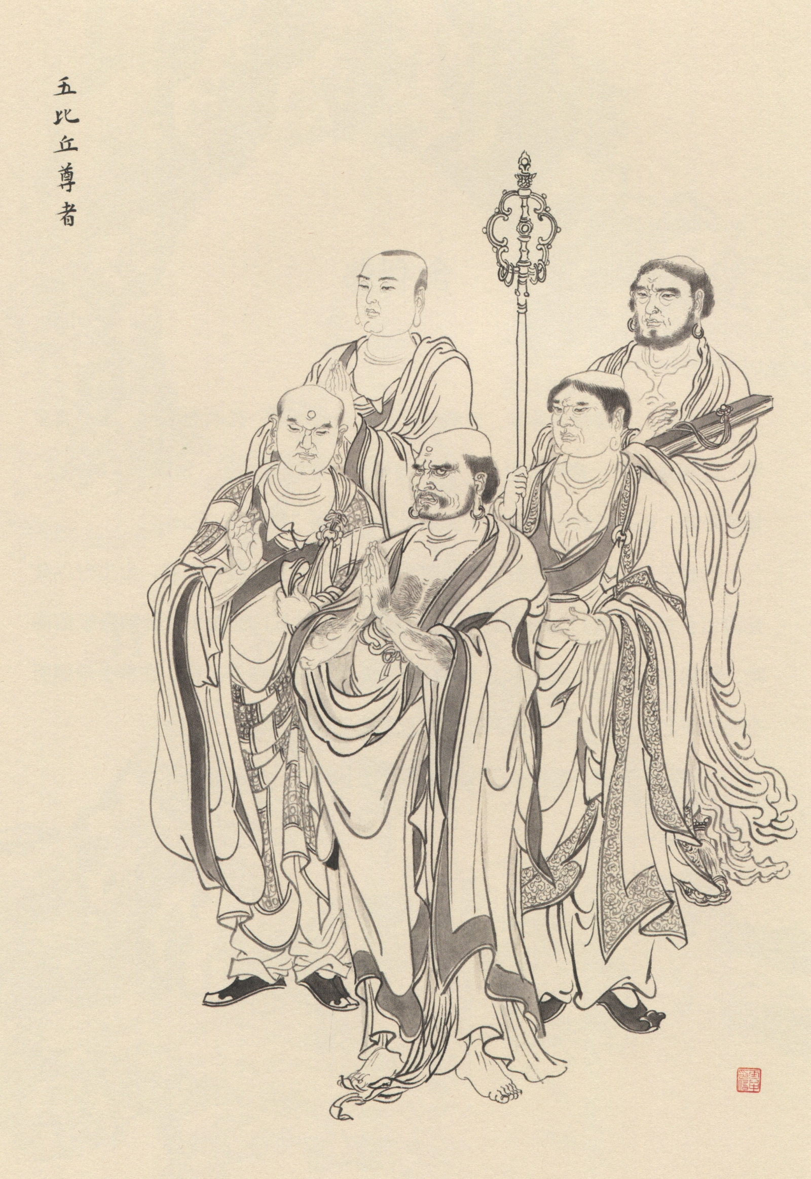 释迦牟尼离宫出家, 赴雪山苦行,其父净饭王派遣五位臣仆即:阿若憍陈如、 阿说示 (马胜)、 跋提、 十力迦叶、 摩诃男拘利随侍。 因见释迦放弃苦行,舍之而去。 释迦成道后, 于 “鹿野苑” 为他们说法 (即 “初转法轮”), 于是这五人出家, 成最初的比丘僧团, 为佛教有 “僧宝” 之始, 称为 “五比丘尊者”。后阿若憍陈如成 “五百罗汉” 第一位, 余亦皆得罗汉果位。 本图绘 “五比丘尊者” 群像: 或高鼻深目, 或广颐宽额, 形态各具。