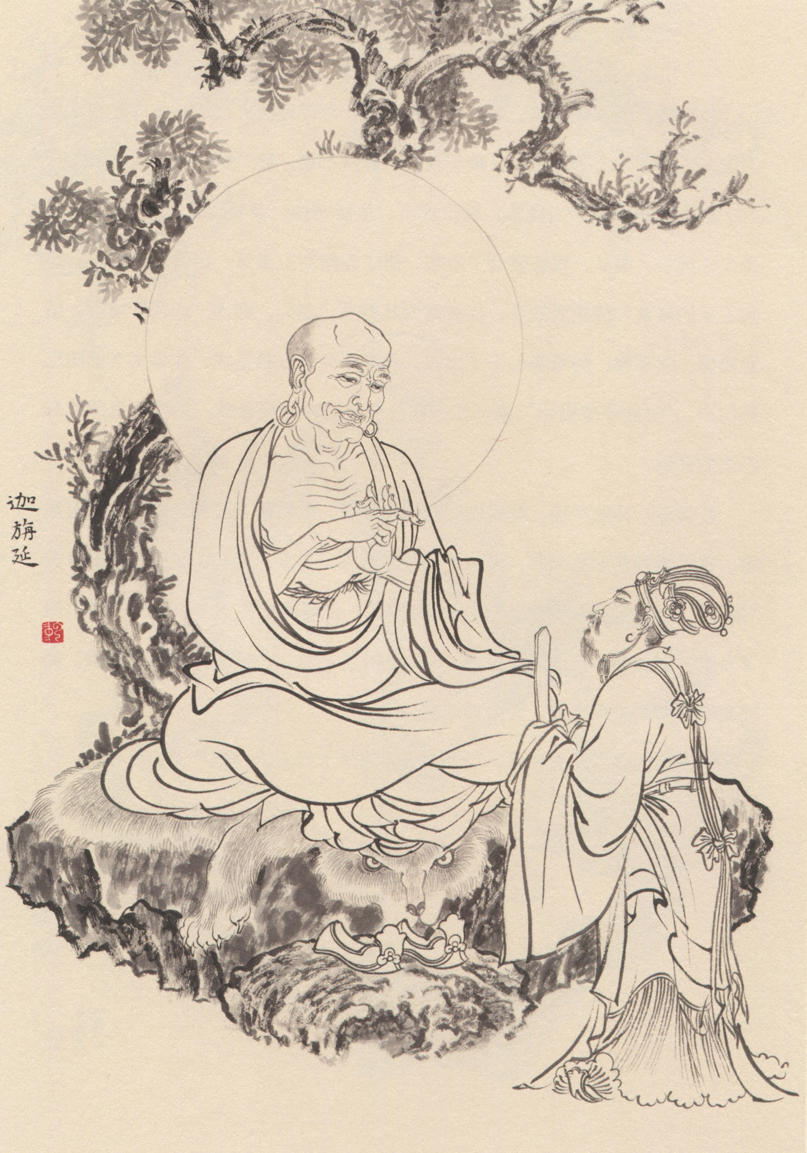 本图绘迦旃延趺坐岩石上说法, 下列一王者虔诚静听,当是教化时节。