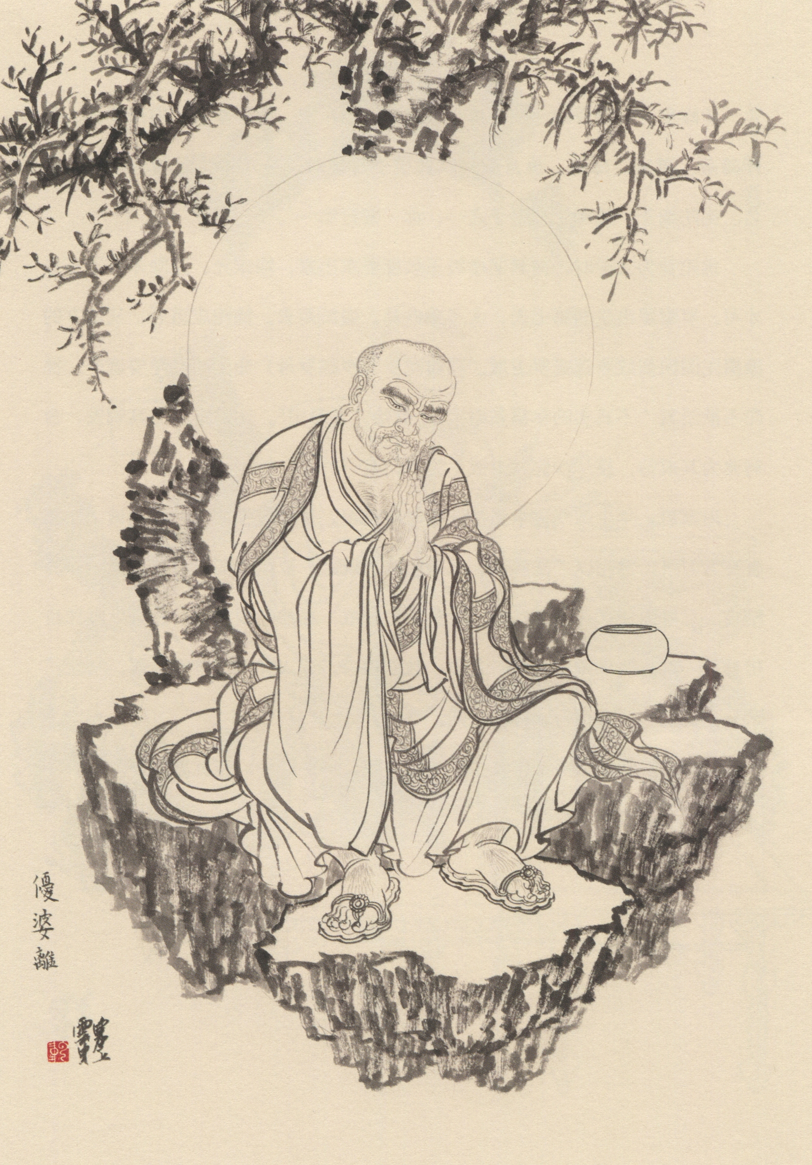 本图绘优婆离低眉垂目,双手合十, 端坐于岩上,一副严谨比丘相。