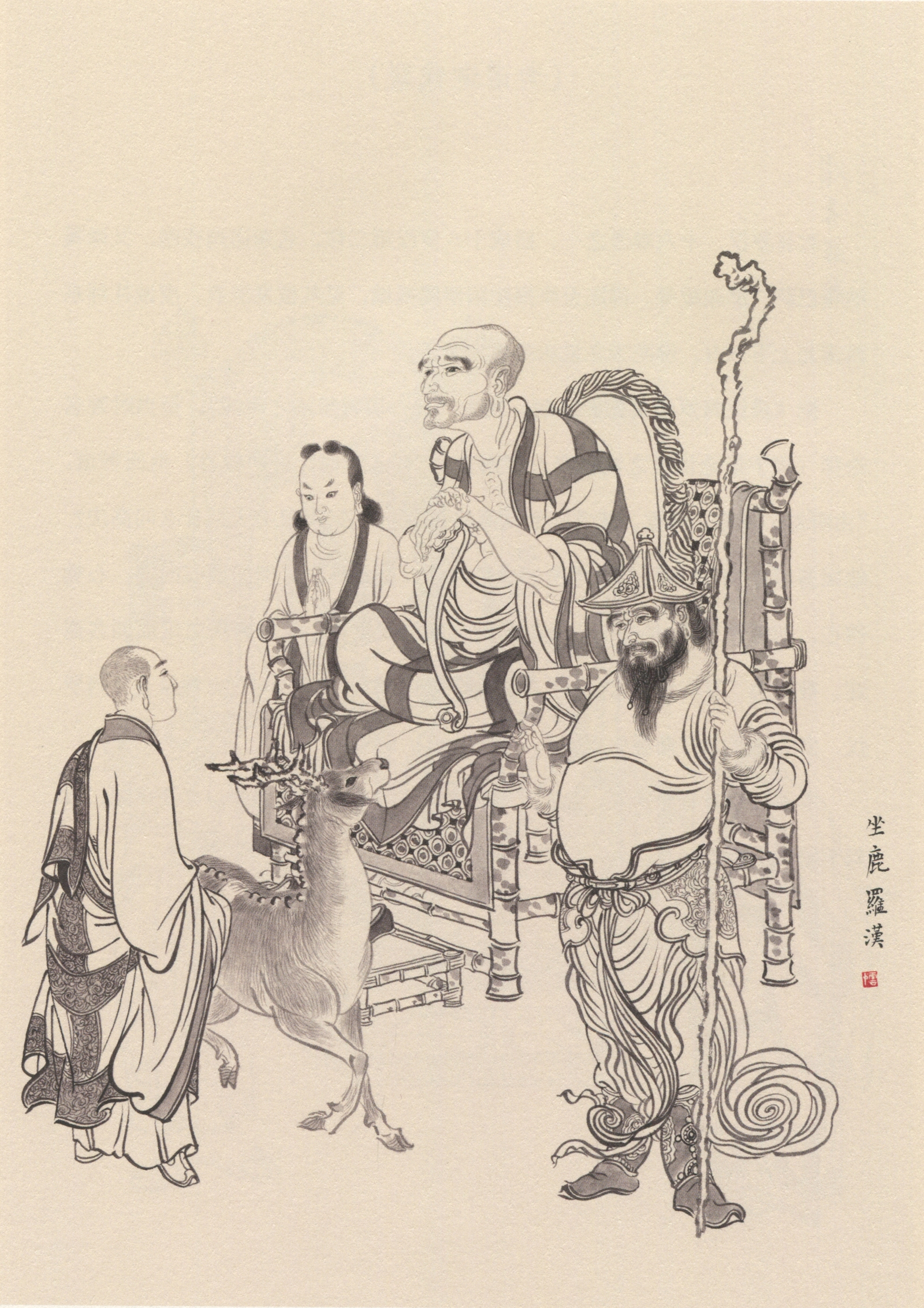 本图绘尊者趺坐竹椅, 双手支如意, 泰然自若,清高自赏, 下列有一鹿。