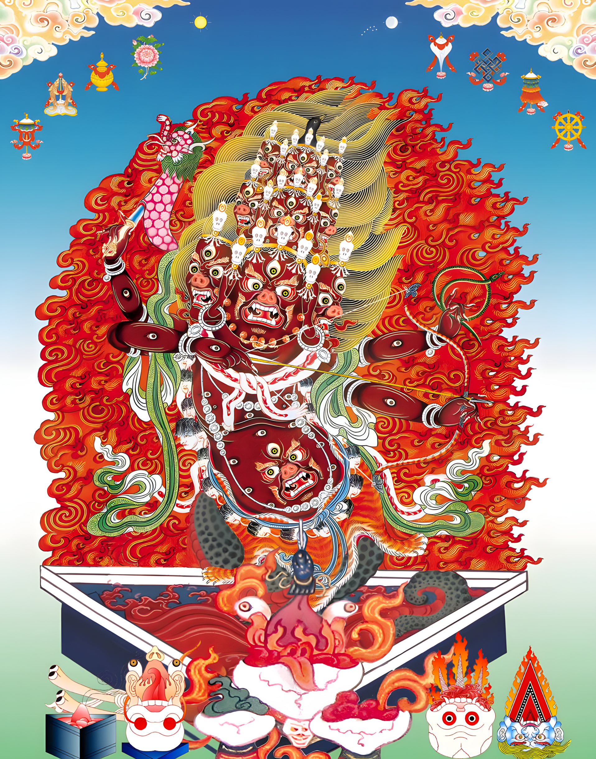 【Ra哈拉护法】: 又名【毗纽天】、【摧敌大遍入】护法。遍入者是为能够自在摄入五大——地、水、火、风、空也,亦是宁玛巴三大不共护法之一,司护持降伏法成就。 此尊住怖畏尸陀林恶园,血脂波涛之内。罗候魔曜,身烟灰色,有九首,顶有老鸦首。九首皆载五骷髅冠,披人皮,下著虎皮裙,项挂鲜血人首,以蛇饰骨饰为身庄严。四臂主二手持弓箭作射状,右次手执摩羯海怪幢,左次手执蛇绳,全身皆眼,身以下乃龙形,作蜿蜒状。眷属有四位东嫫、罗侯廿八星宿、豺狼、黑狗、八部傲慢魔军。