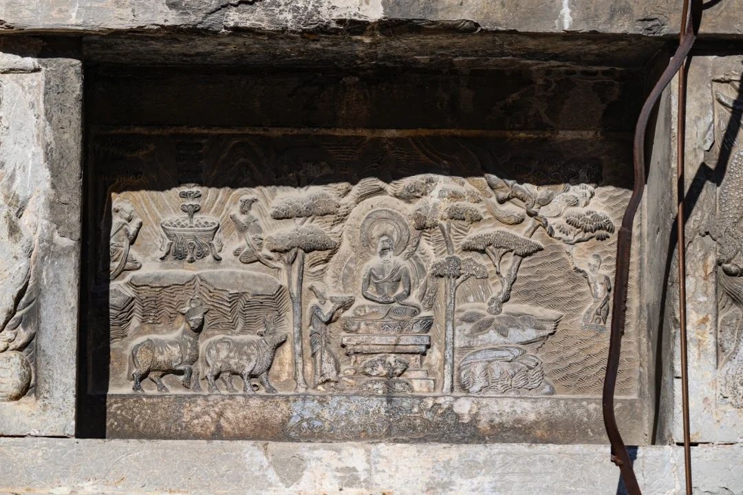 塔基座八面浮雕展现了释迦牟尼的八相成道图,以精湛的艺术手法演绎了佛祖一生的故事。浮雕从托生母胎、树下诞生、逾城出家、雪山苦行、降伏魔军、树下成道、鹿苑说法、鹤林人灭等八个关键阶段,呈现了佛祖的传奇生涯。第一层塔身最为显著,采用了高浮雕佛像,包括普贤、文殊和四大天王像,以及二面带铺首、门钉的关闭状版门。每角还设有倚柱,檐下横梁斜面刻有飞天等浮雕,与敦煌石窟的风格相似,展现了舍利塔的艺术精髓。